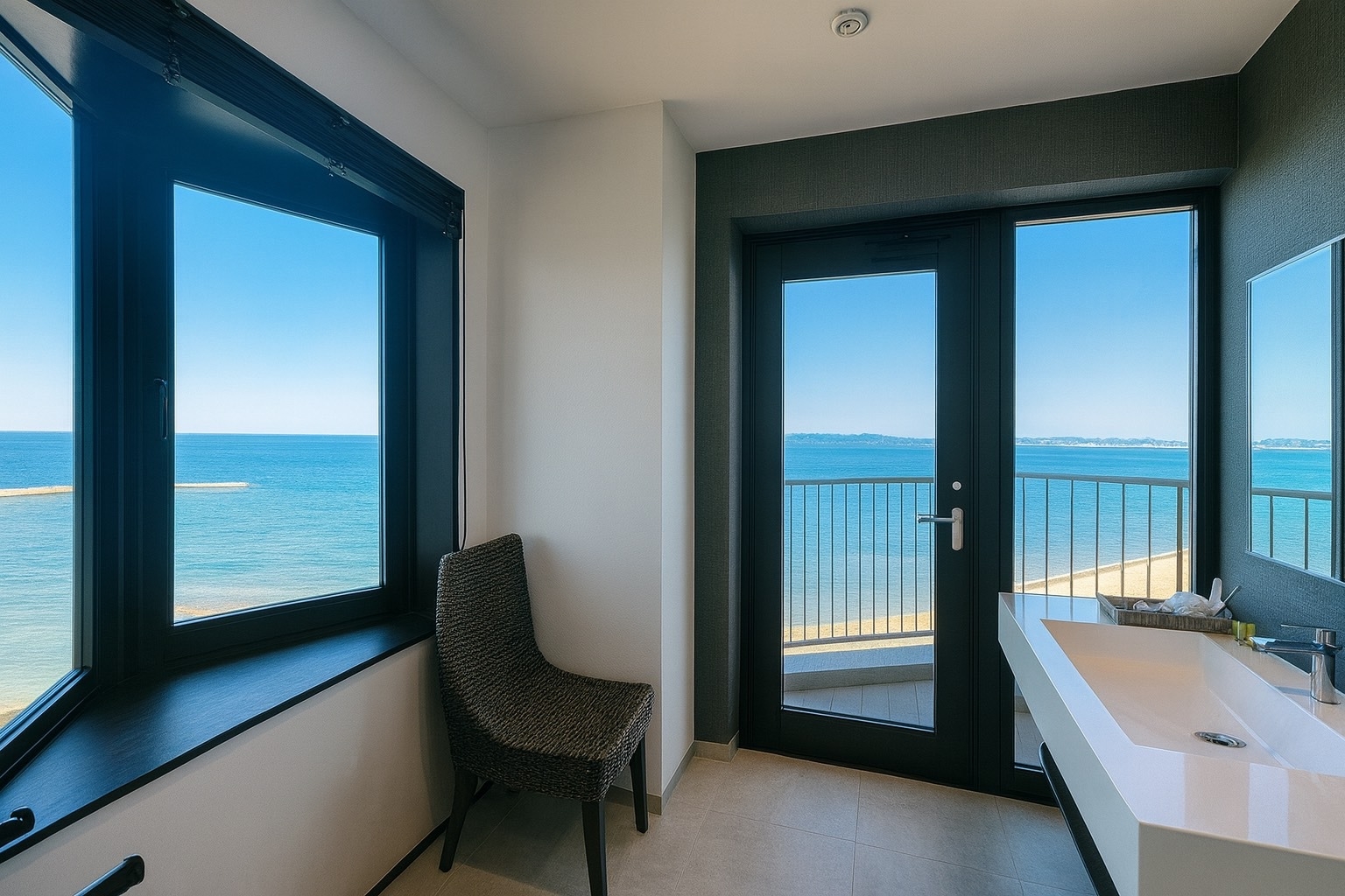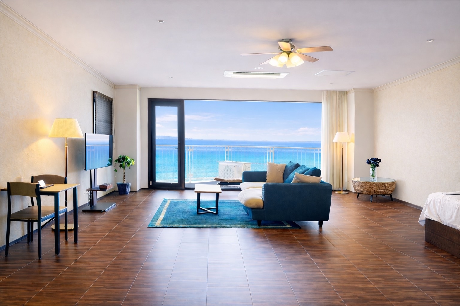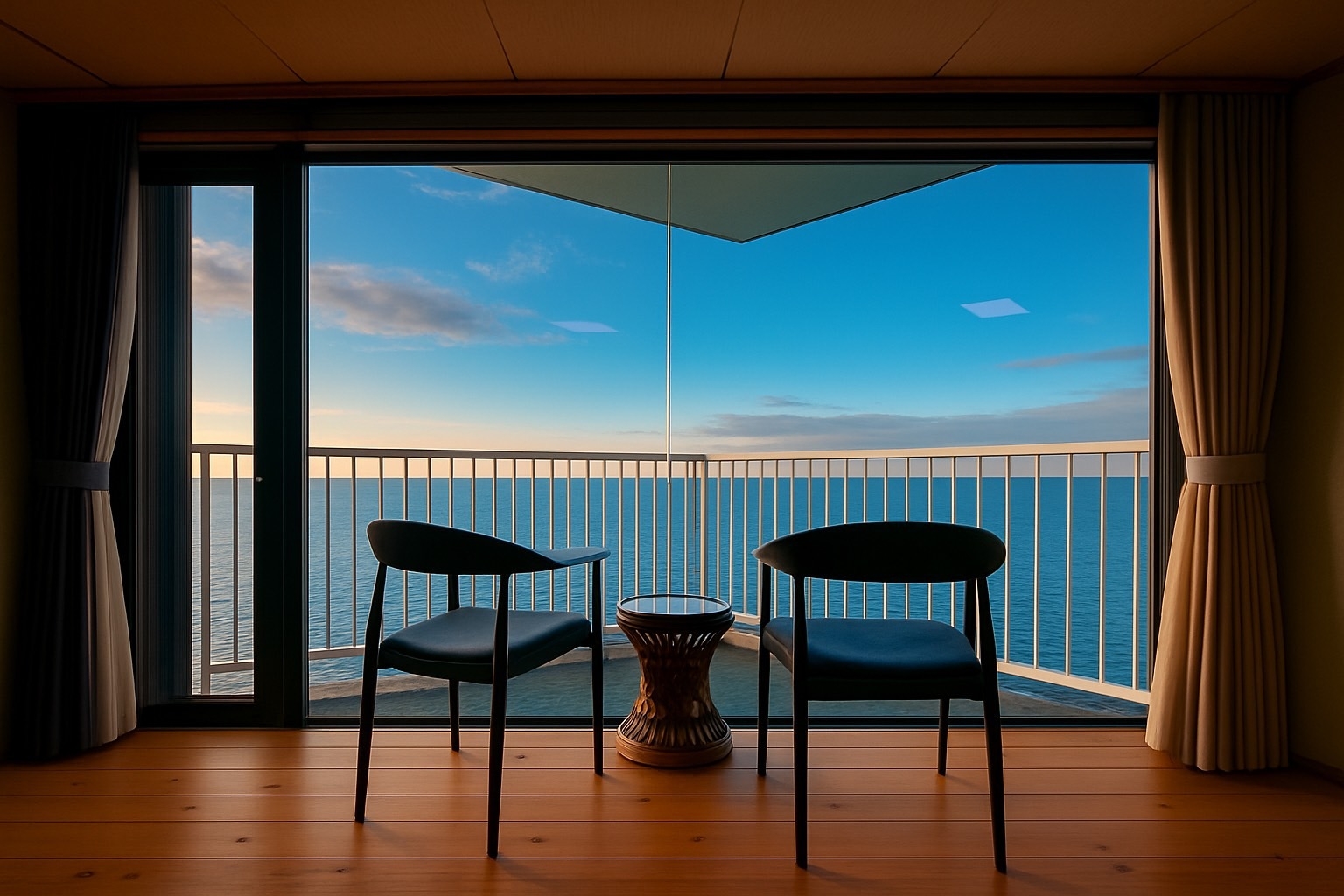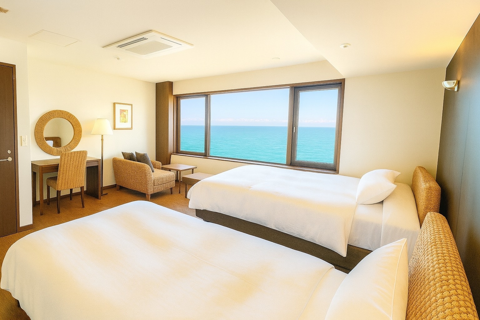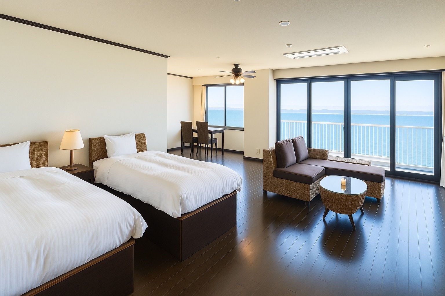 74平米 エグゼクティブサイズのオーシャンビュー。 室内にお風呂はございませんので3階の貸切展望風呂をご使用ください。