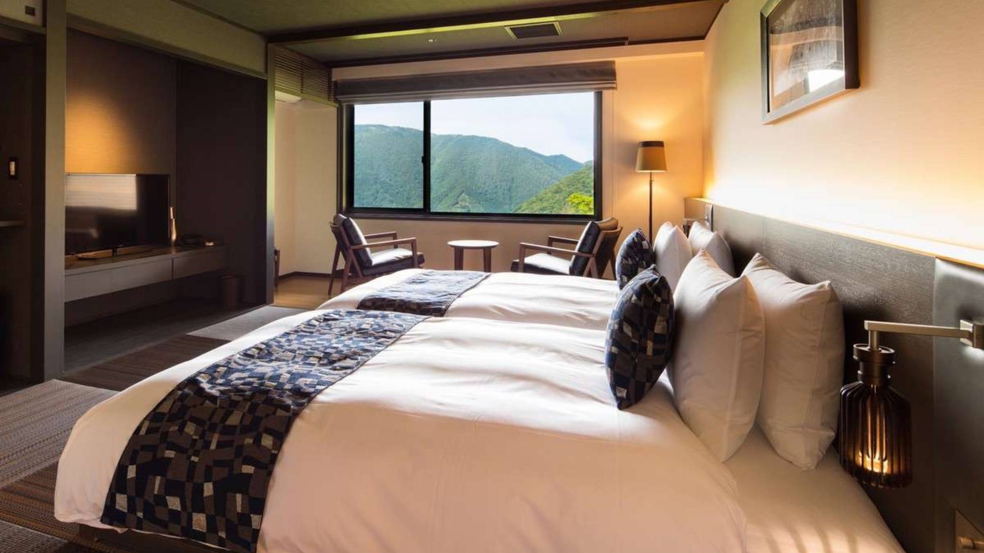 ベッド2台とお布団をご用意した3人でゆったりと過ごしていただけるツインルームです。当ホテルオリジナルのデイベットに座り、贅沢な景色とお酒をお楽しみください。