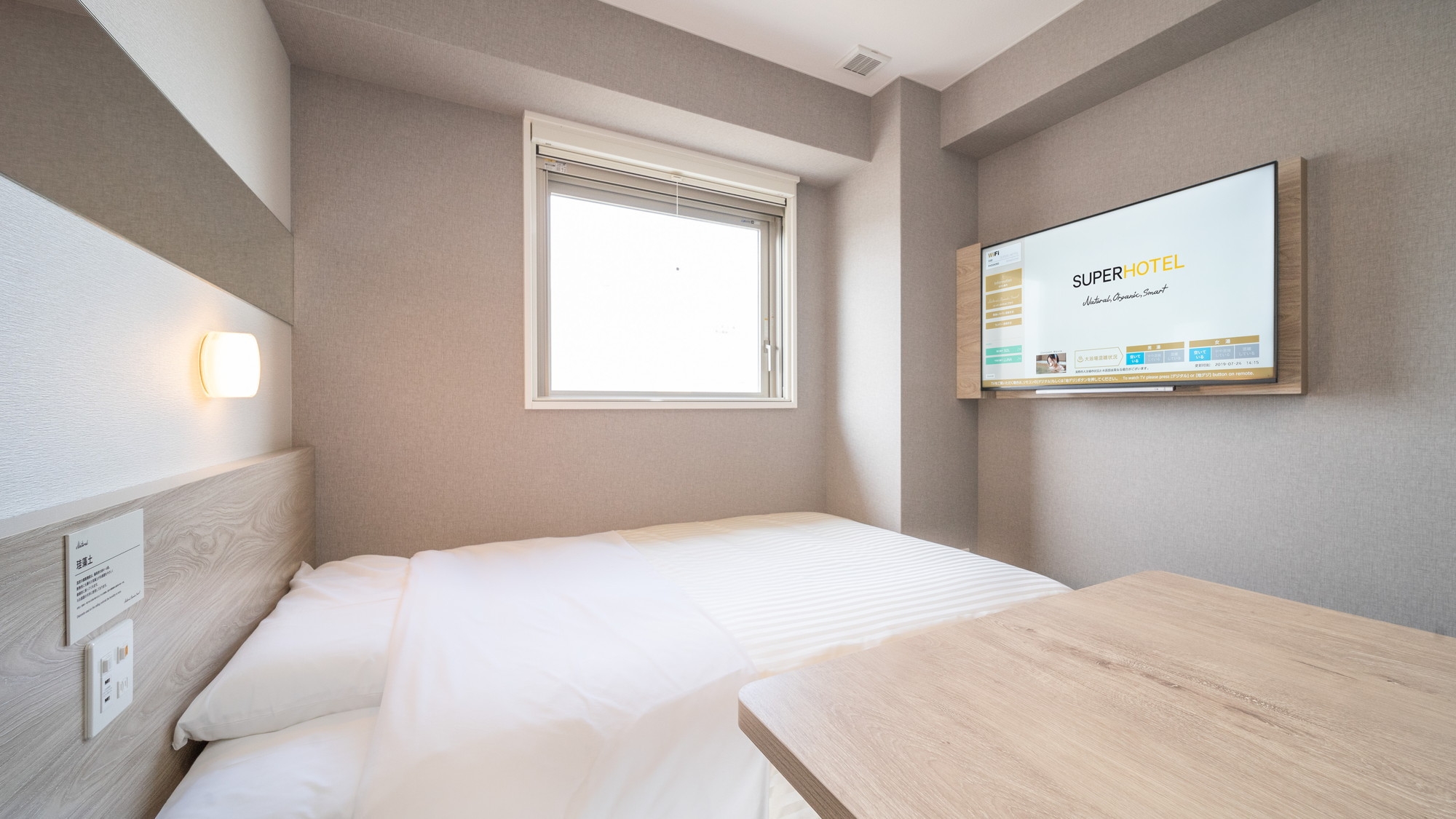スーパーホテルで最もスタンダードなお部屋である【スタンダードルーム】です。150cm幅のダブルサイズのワイドベッドでぐっすりお休み下さい。