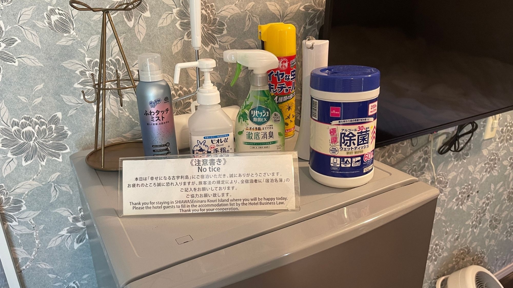パジャマ(ガウン)、ボディーソープ、シャンプー、リンス、フェイスタオル、バスタオル、歯磨きセット、髭剃り、シェービングクリーム、ブラシ、ティッシュペーパー、紙コップ、スプーン、割りばし、水3本