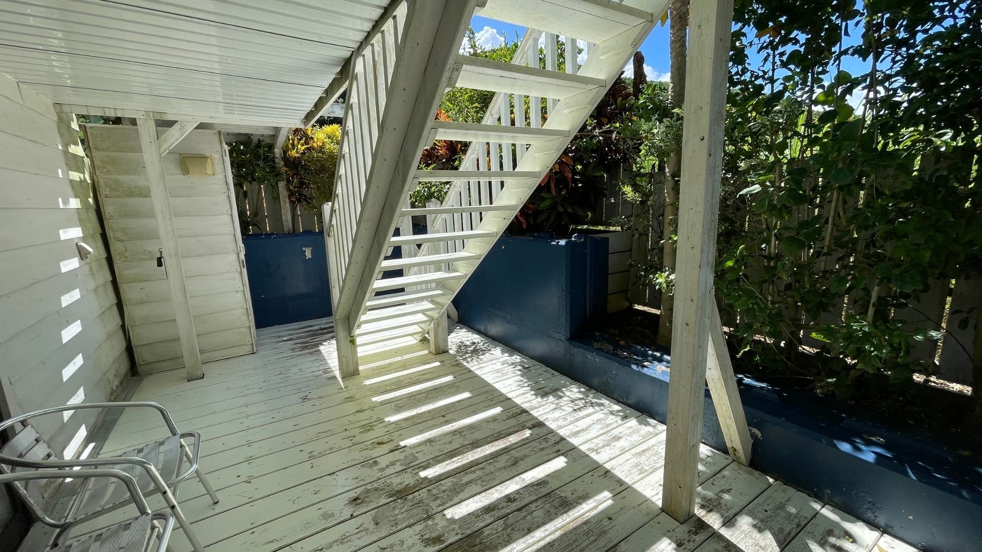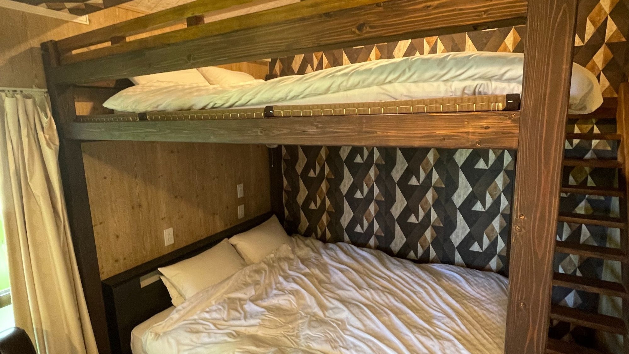 ダブルベッド1台にシングルベッド2台。1階と2階に専用テラス有。おしゃれな隠れ家のような居心地のいい客室です。