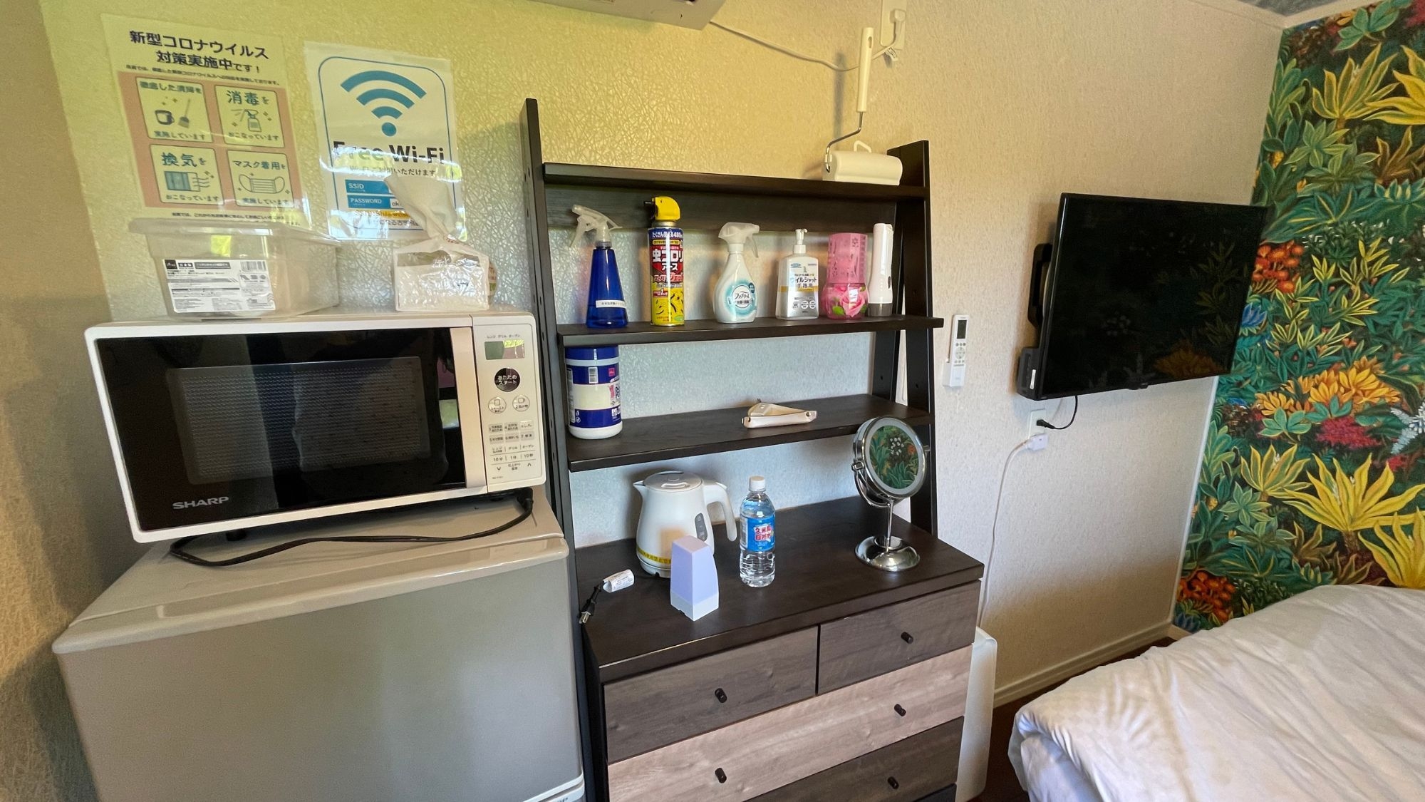 テレビ(YouTube・ameba TV)、エアコン、ドライヤー、冷蔵庫、電子レンジ、電気ケトル、温水洗浄便座、Wi-Fi(ネット環境を100%保障するものではございません)