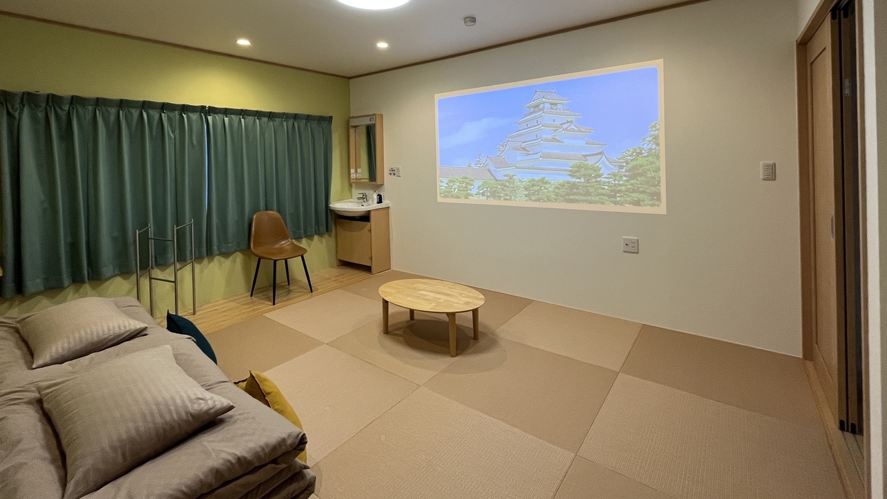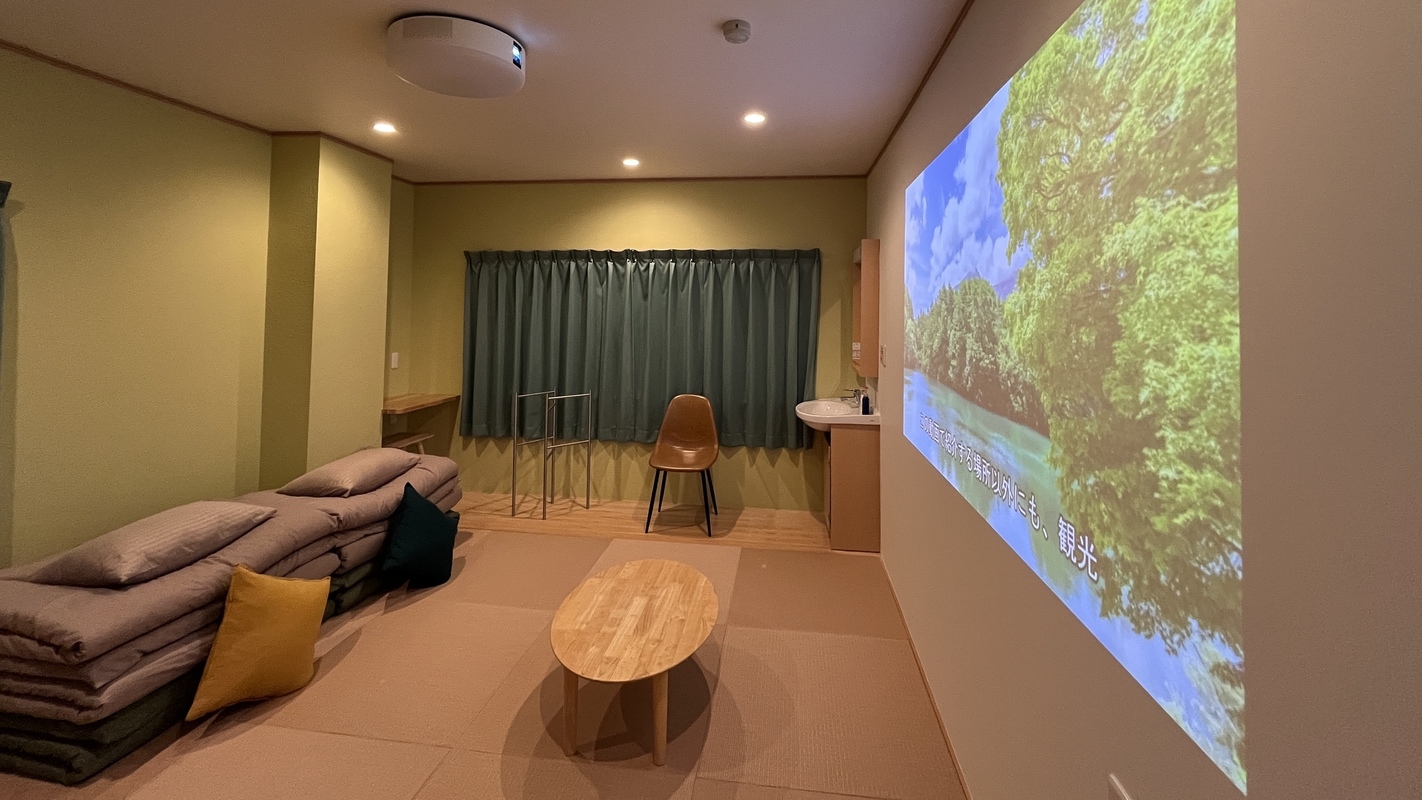 和洋室最大4名/トイレ/禁煙/プロジェクター/Wi-Fi/エアコン/スリッパ/金庫/バス無し(大浴場をご利用下さい)共有シャワースペース有TV無