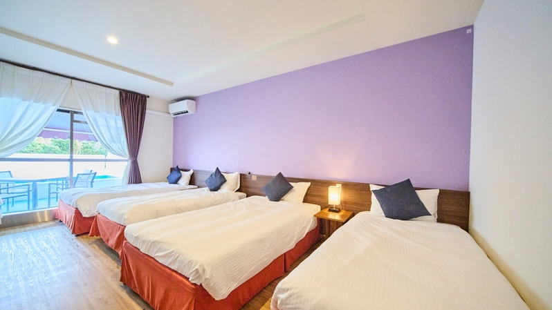 定員1〜4名 シングルベッド4台 幅 3.4m × 深さ0.45mの専用のプールを備えたテラス付 周囲を気にせずご家族だけのリゾートタイムを楽しめます