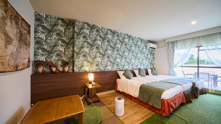 定員1〜4名 シングルベッド4台 バス・トイレ別 子どもたちに大人気の恐竜たちと一緒にお泊まりできる特別ルーム 広々としたバルコニー付