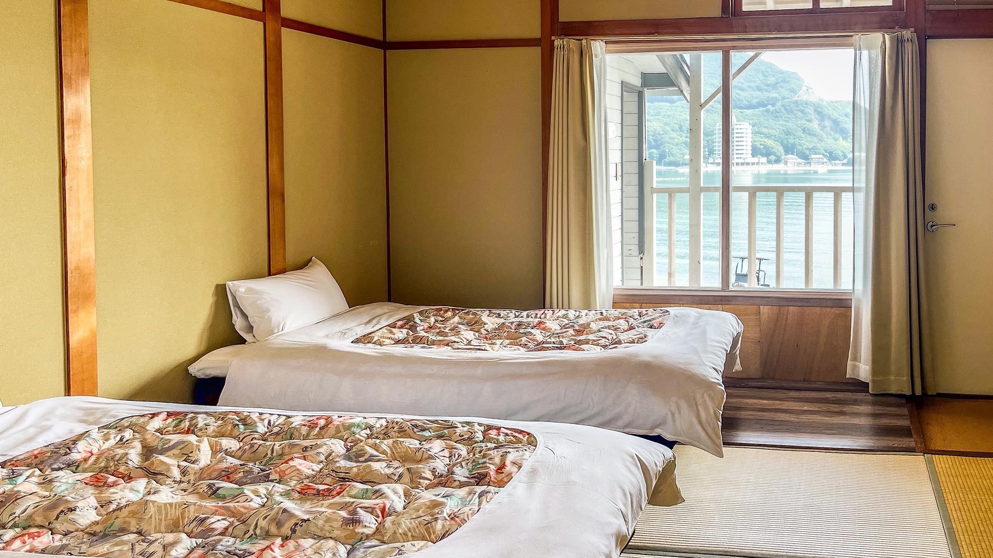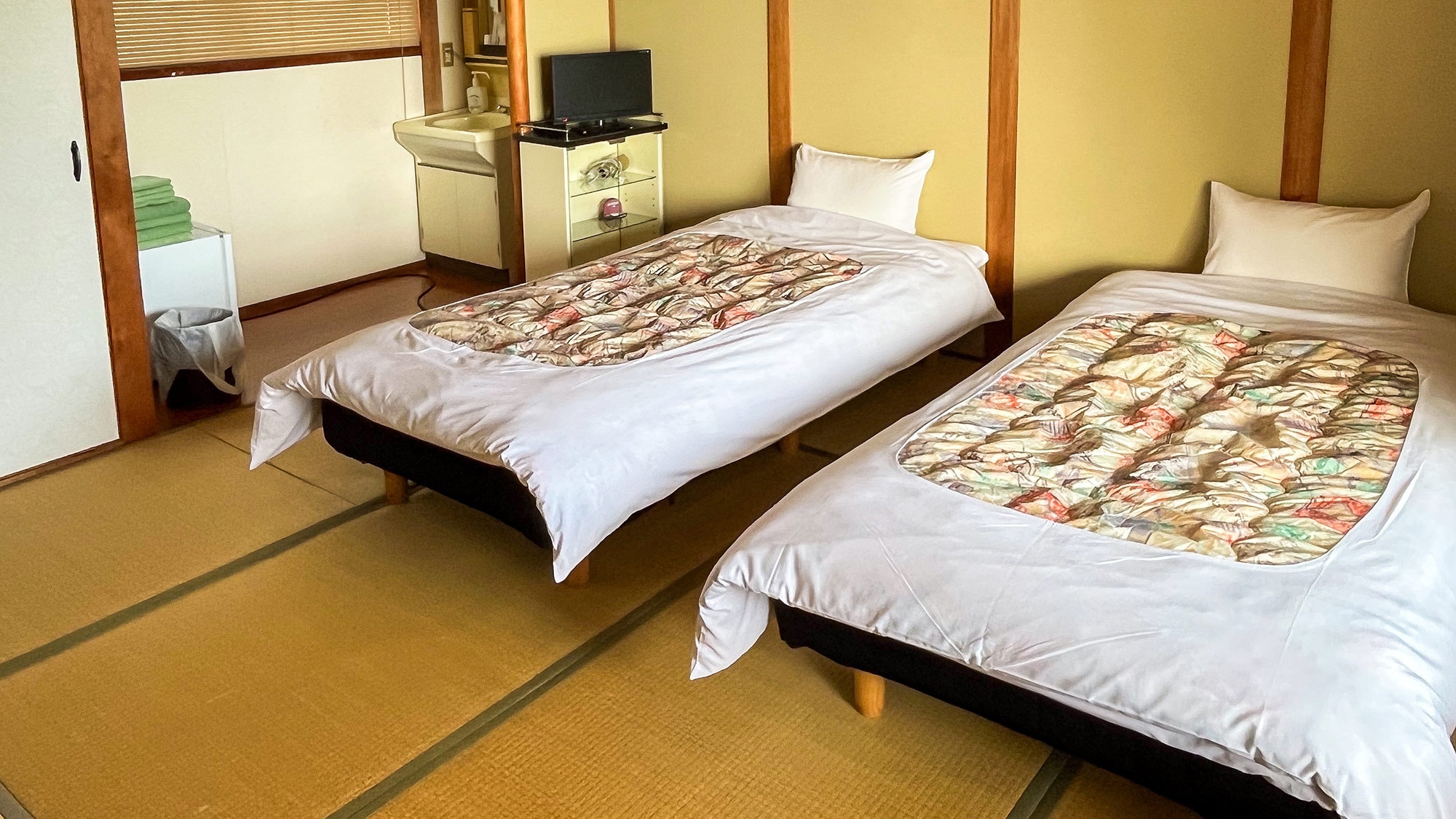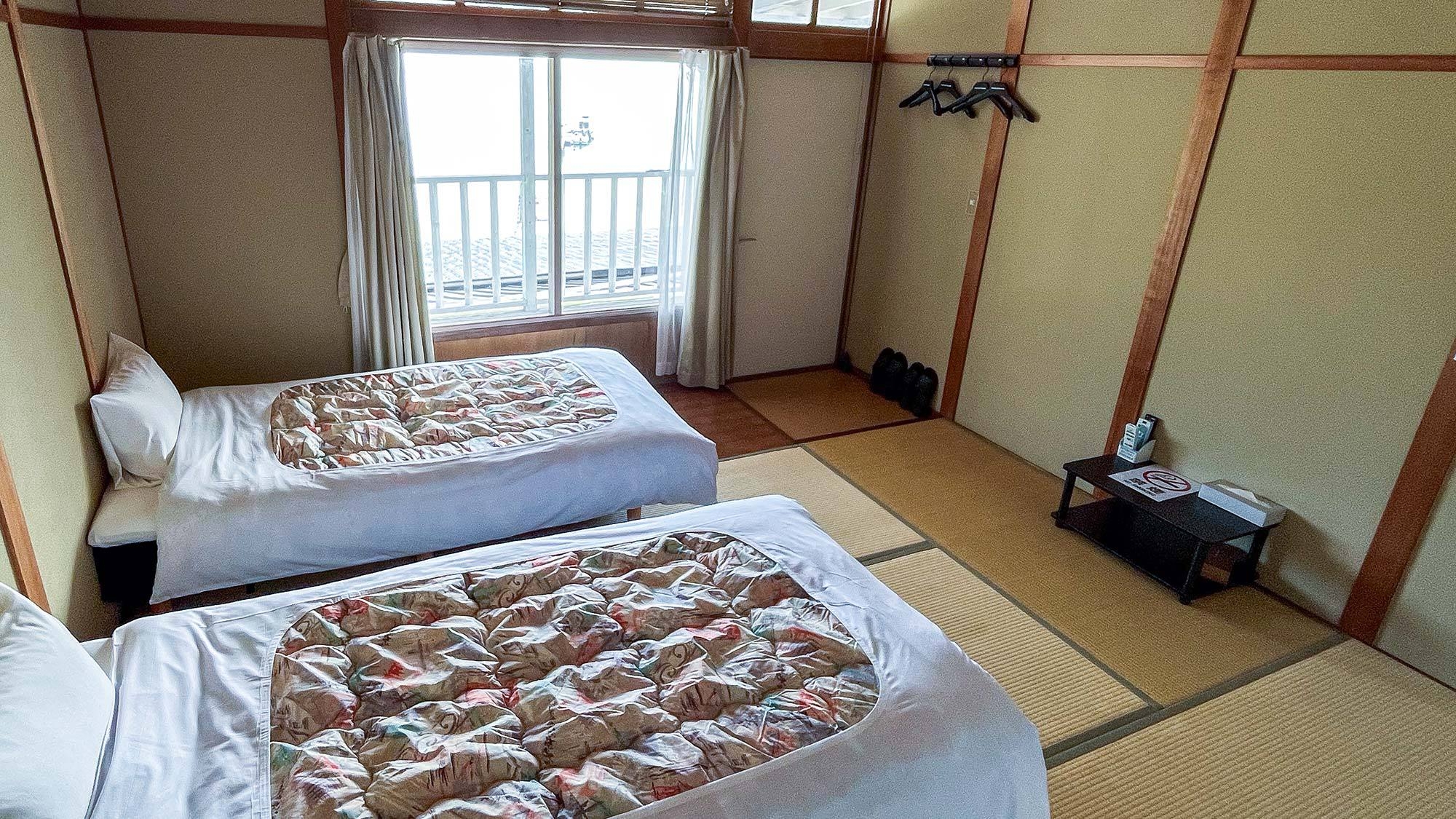 和室に足つきマットレス2台を設置で最大2名様までご宿泊可能。眺めも良くコンパクトながらも快適にお過ごしいただけます。テレビ・空調・洗面台完備。バス・トイレ共用。