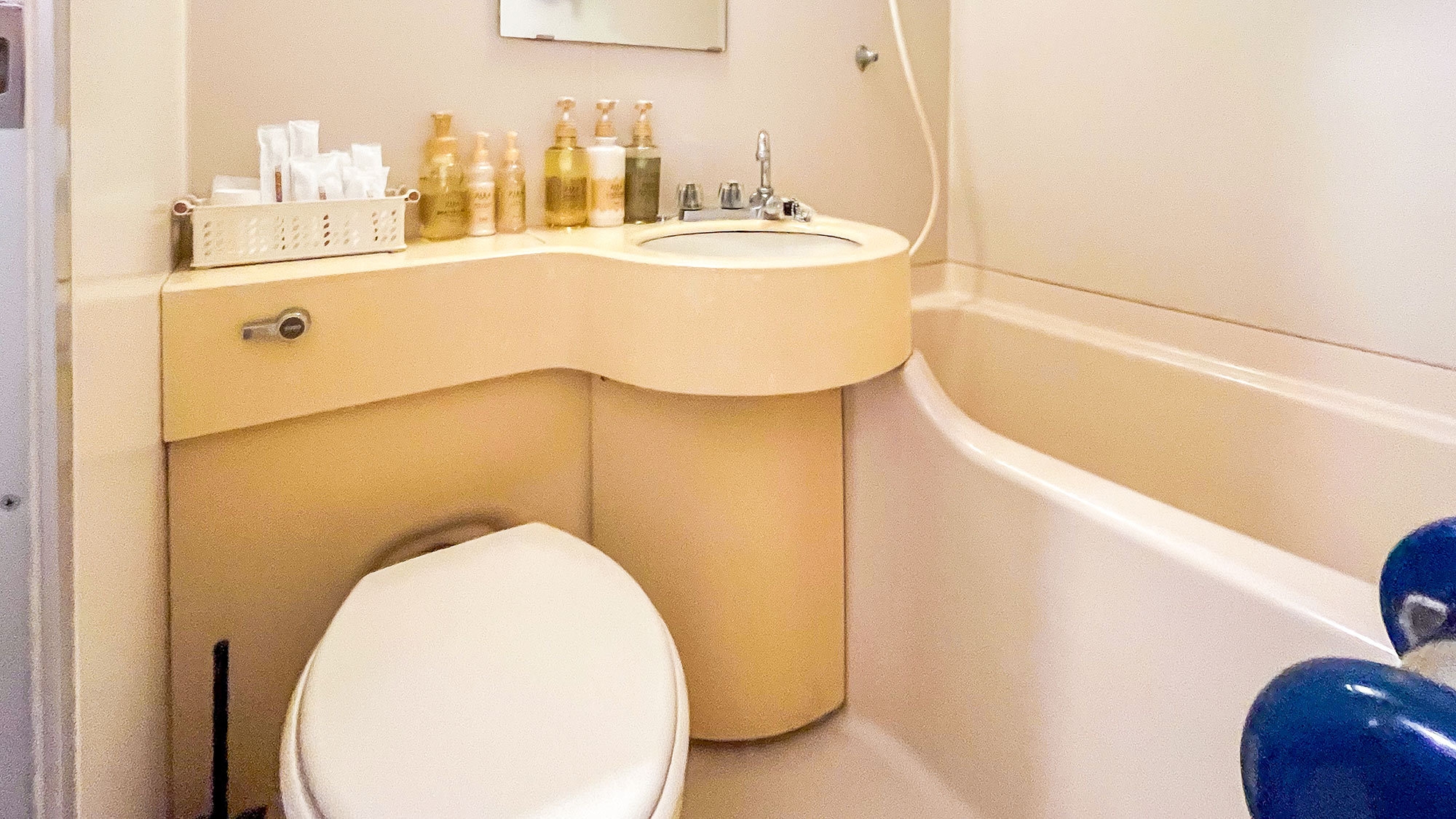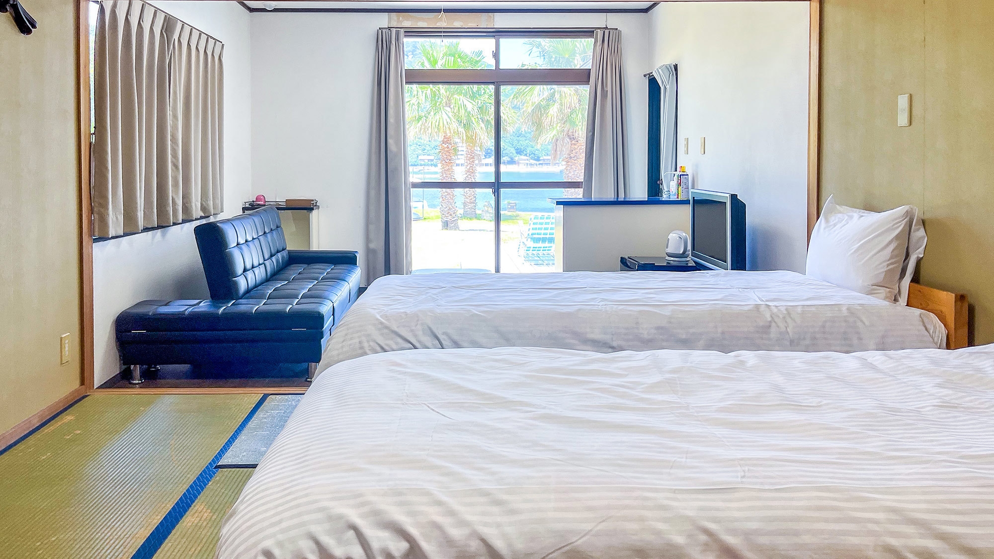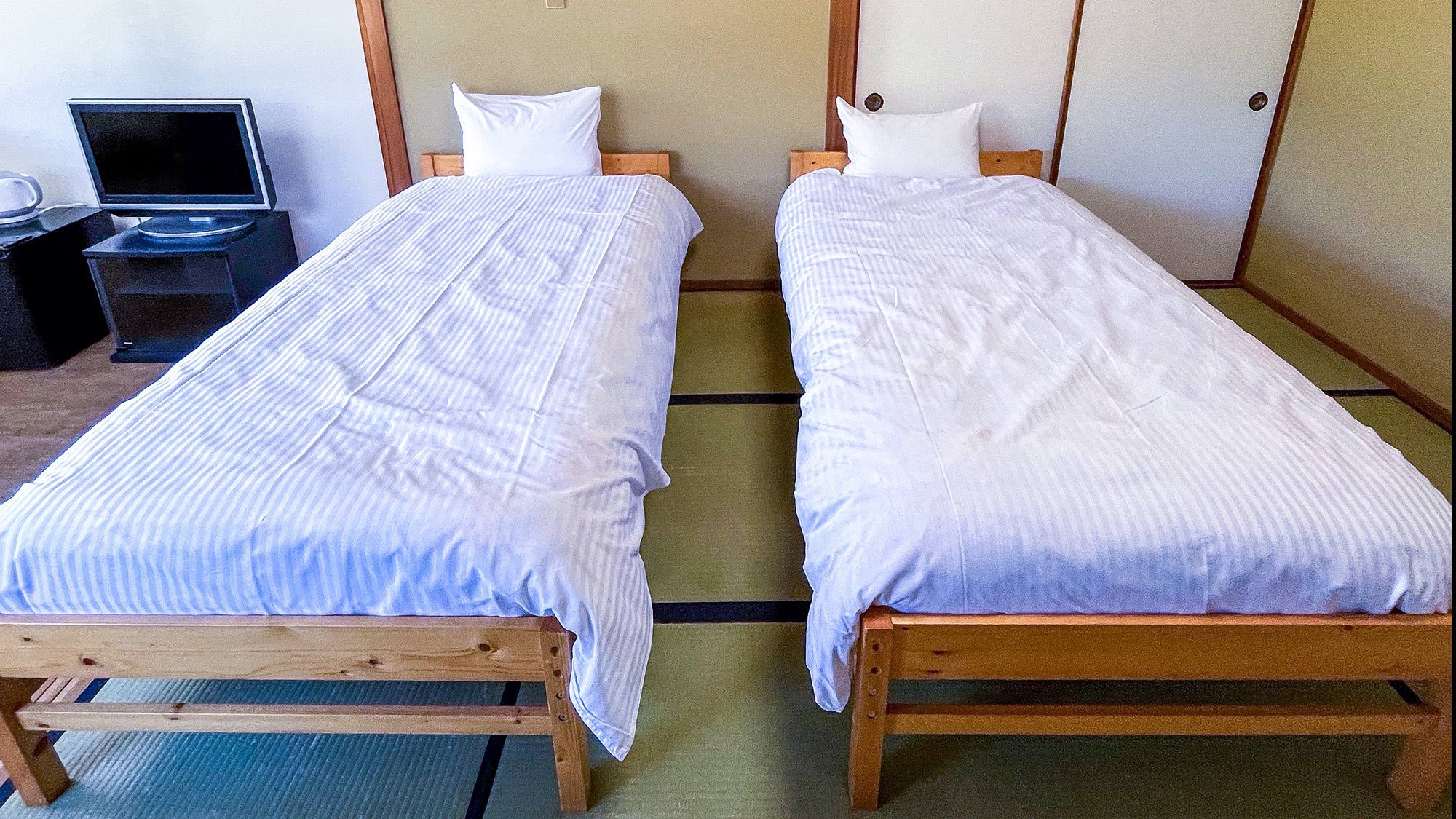 和室に足つきマットレス2台を設置で最大2名様までご宿泊可能。眺めも良くコンパクトながらも快適にお過ごしいただけます。テレビ・空調・洗面台完備。バス・トイレ共用。