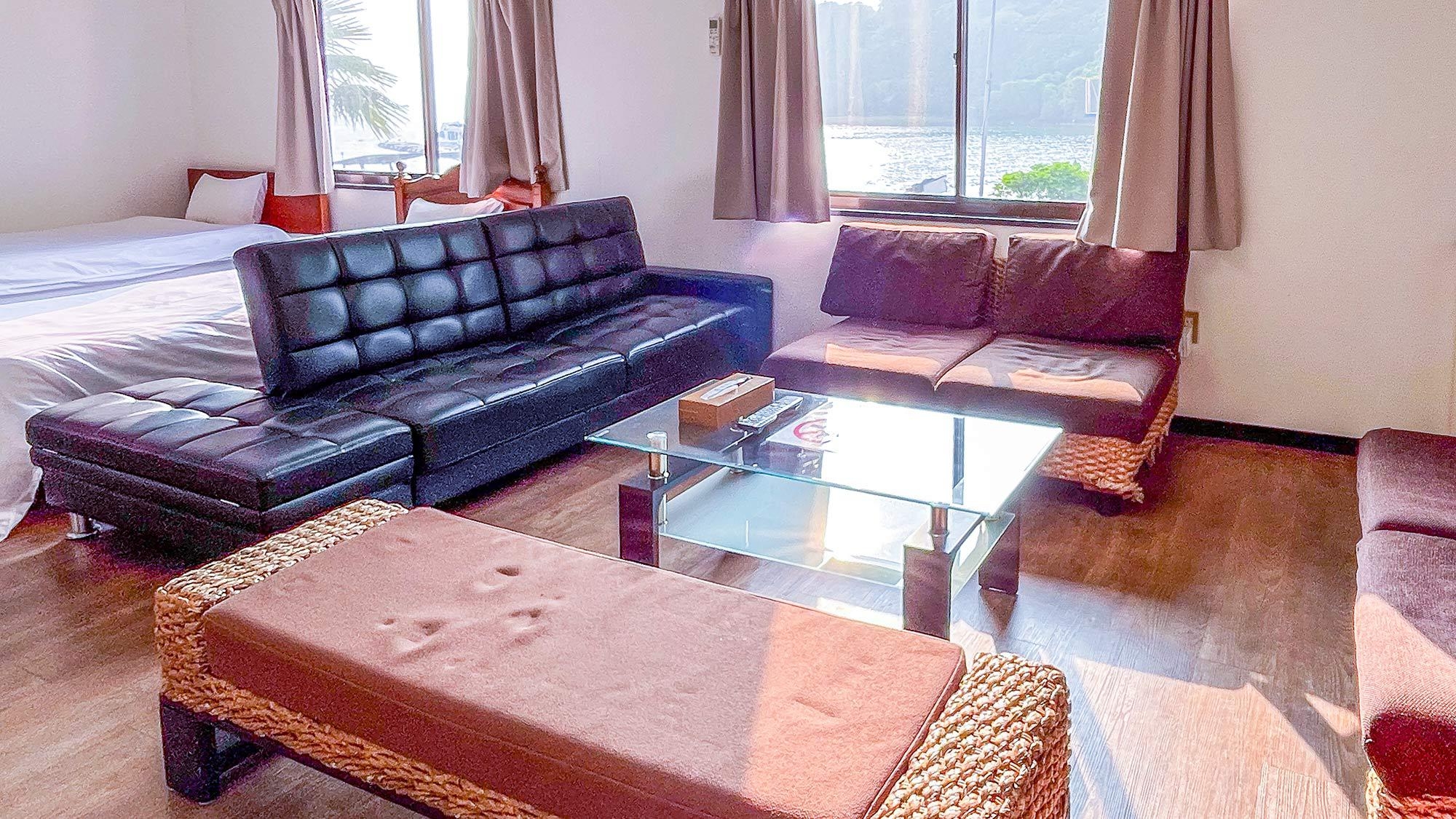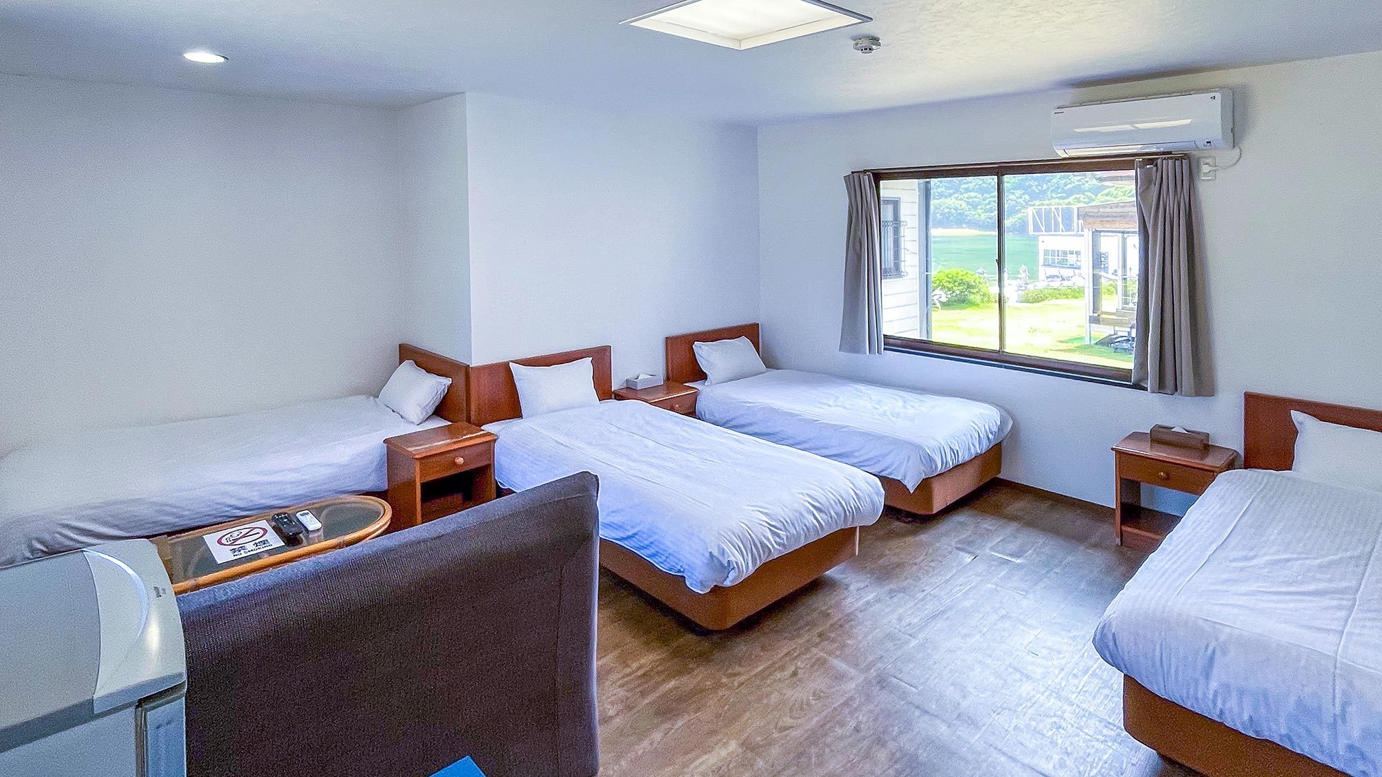 15帖の洋室にシングルベッドを4台設置し、最大4名様までご宿泊可能。ソファスペースもあり、のんびりとお過ごしいただけます。テレビ・空調完備。バス・トイレ付。