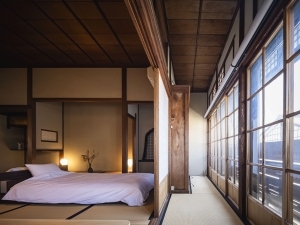大正末期に当家の別邸として建てられた町家の2階を貸切でご利用いただきます。セミダブルベッドが2台ある寝室、広間にもお布団を敷き最大4名様までご利用可能です。
