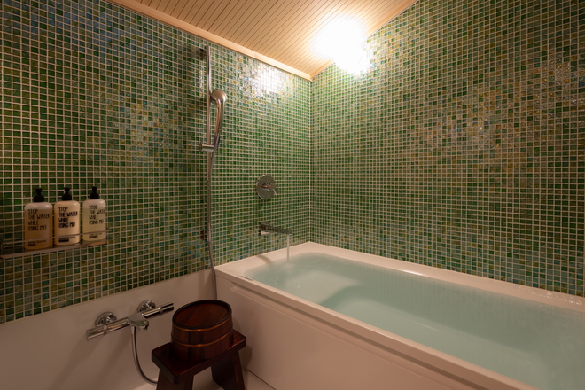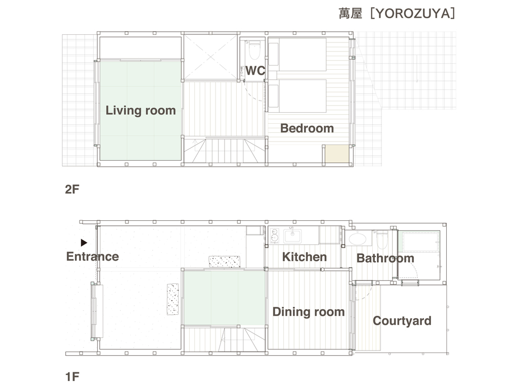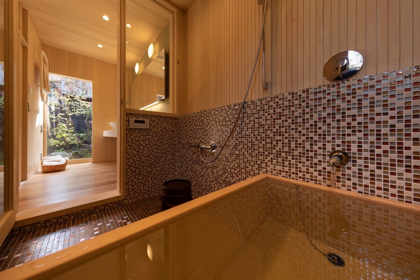 旧東海道に面した町家のツインルーム. 共有ラウンジを併設. サブリビング、中庭を臨む窓有り.
