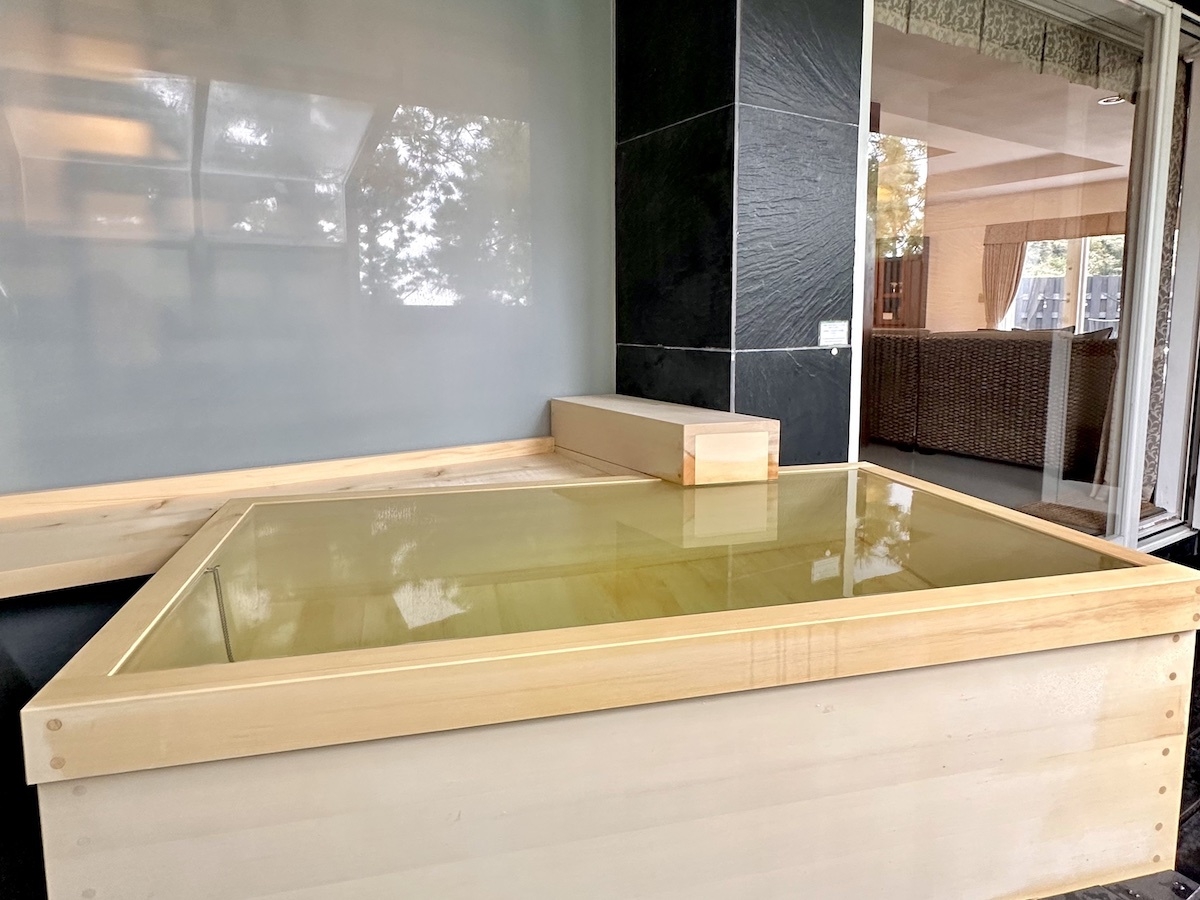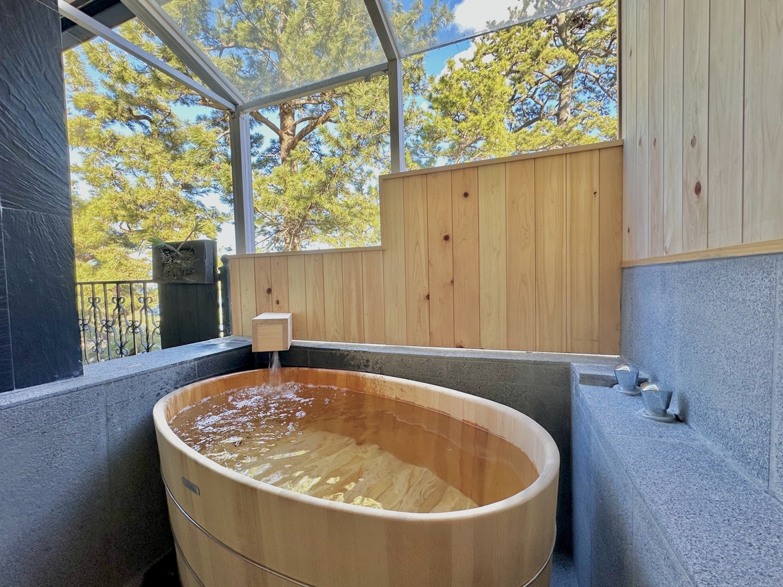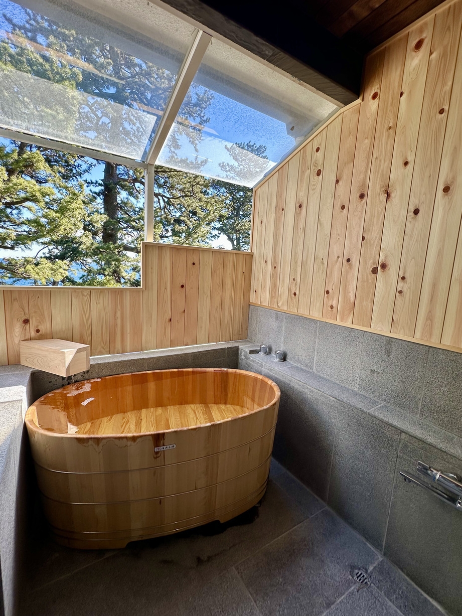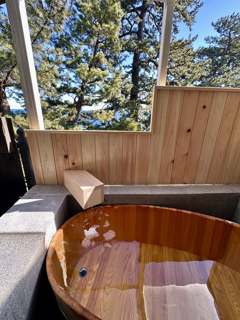 全室に源泉かけ流しの半露天風呂がございます。波の音を聞きながら、自分の好きなタイミングで好きなだけ温泉をお楽しみください。