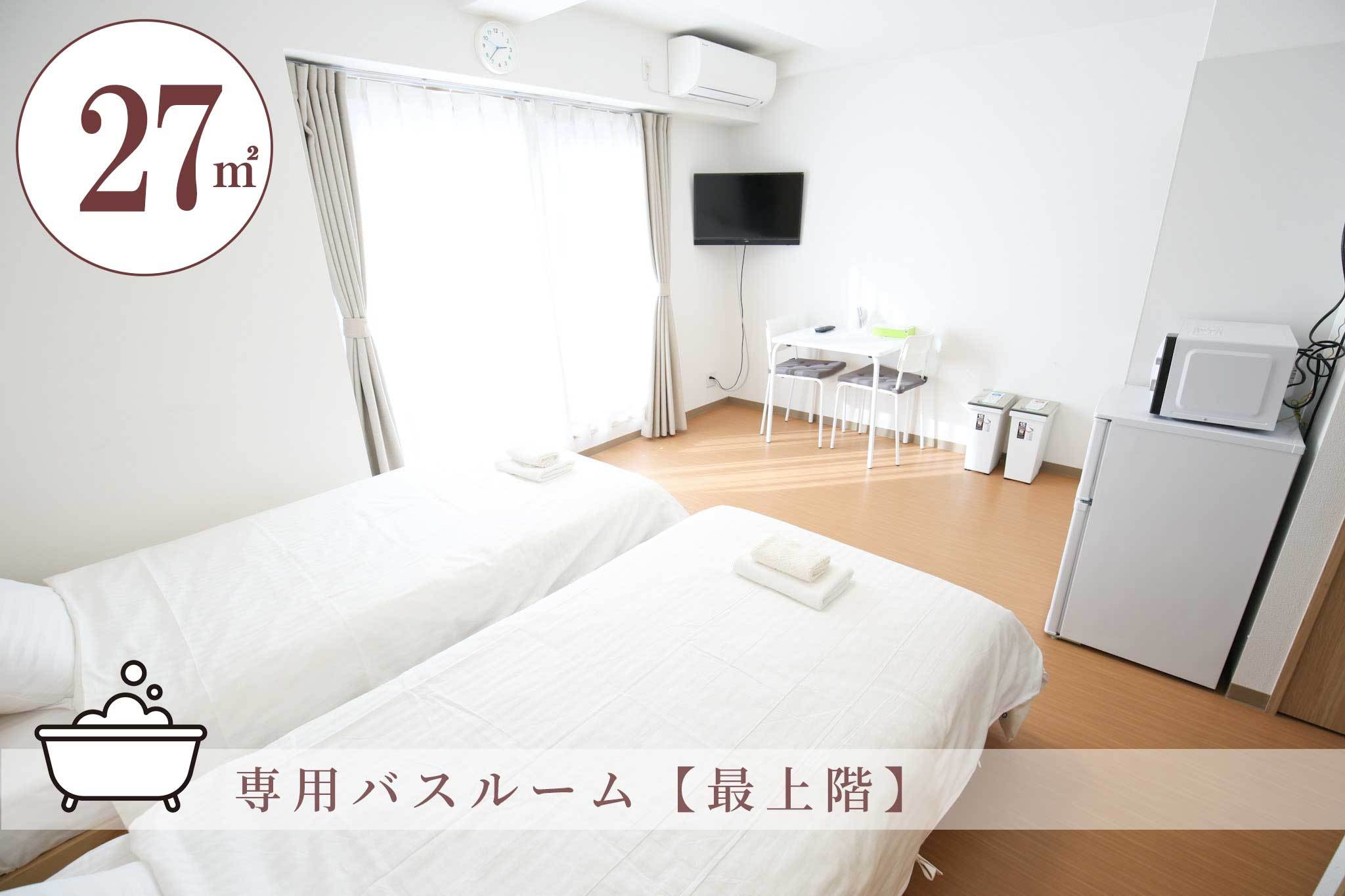 【禁煙】鶴橋駅徒歩2分ゆったり27平米(ベランダあり)。専用バスルーム付き完全個室タイプのお部屋!キッチン完備で長期滞在にも対応。3名様ご利用時はお布団を追加