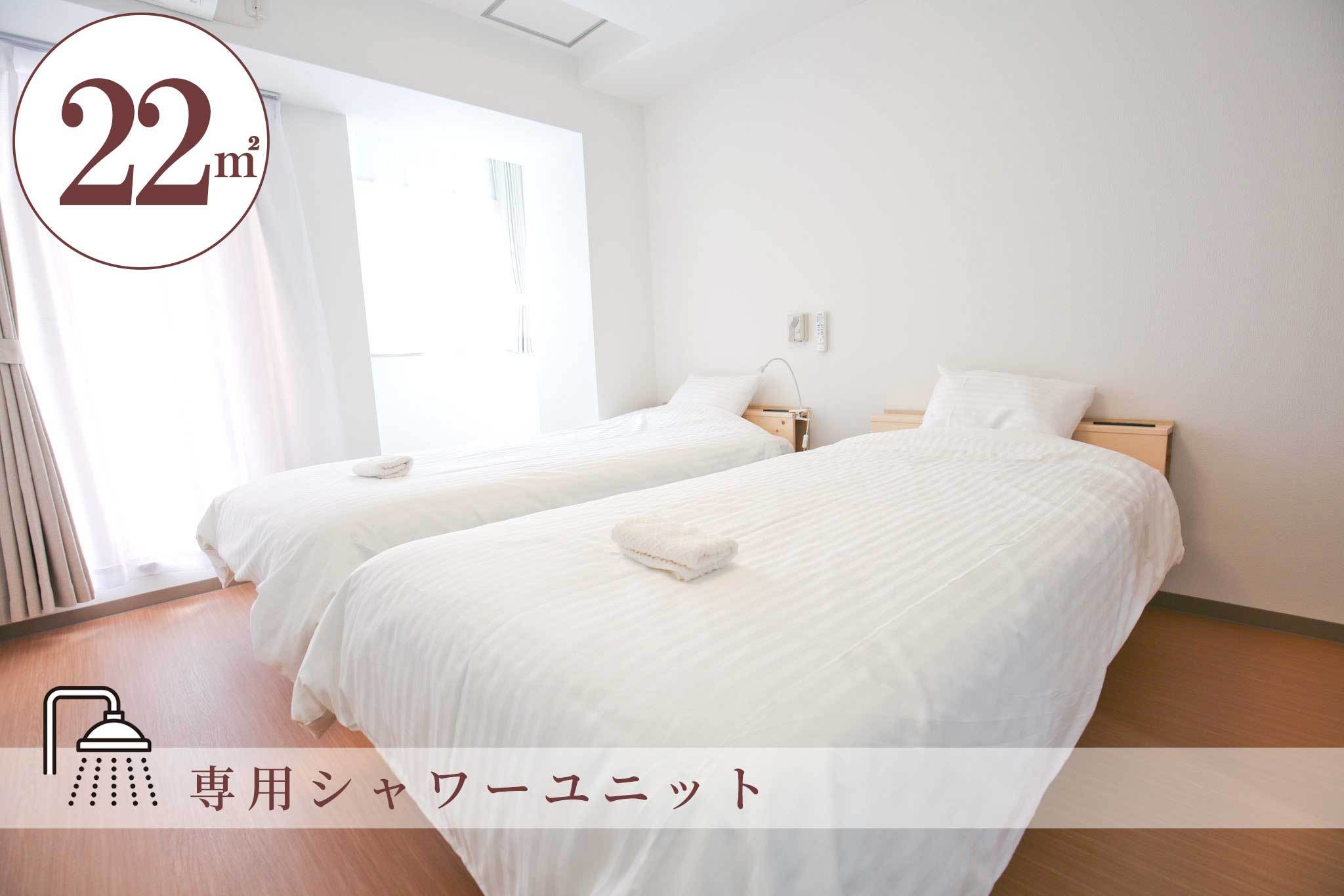 狭い部屋はいやだ、鶴橋駅徒歩2分でスーツケースをゆったり広げれる22平米(禁煙)専用シャワーユニット完全個室タイプのお部屋です。キッチンが完備で長期滞在にも対応