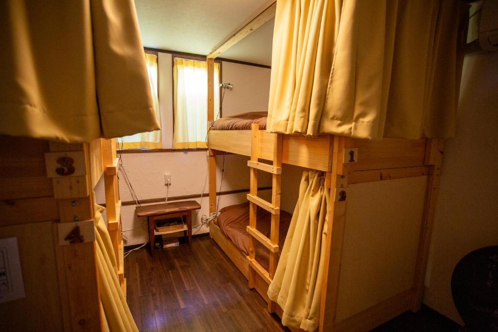 2段ベッドが2個の最大4名のドミトリールーム(相部屋)でシングルベッド1台で宿泊するプラン。他のお客様と一つのお部屋をシェアする形になります。中学生未満のお子さんはお一人まで添い寝可能です。追加料金は不要のため、ご予約時には「大人1名、子供0名」でご予約いただいて構いません。ベッドにはカーテンができるようになっており、プライベート空間をつくることができます。貴重品の管理はご自身でお願いいたします。
