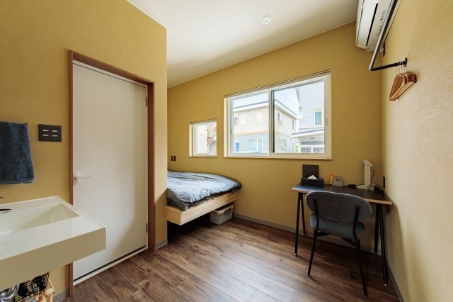 新棟別館1Fのセミダブルベッドを一つおいたお部屋。2名だと少し窮屈に感じる方もいるくらいのサイズです。シャワー・トイレ・洗面台・デスクが室内にあり、洗濯乾燥機・コワーキングルーム・共用トイレが2Fにある建物です。【シェアキッチンについて】冷蔵庫・シンク・鍋・フライパン・包丁・食器・炊飯器・トースター・電子レンジ・ケトル・油・塩・砂糖など簡単な料理のための必要最低限の道具をご用意しています。どうぞお気軽にご利用ください。