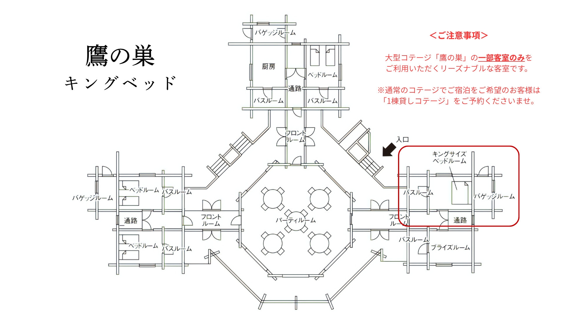 ※要確認※ 大型コテージ「鷹の巣」の客室部分のみをご利用いただくリーズナブルな客室。通常コテージをご希望のお客様は【テラス付き1棟貸コテージ】をご予約下さい。