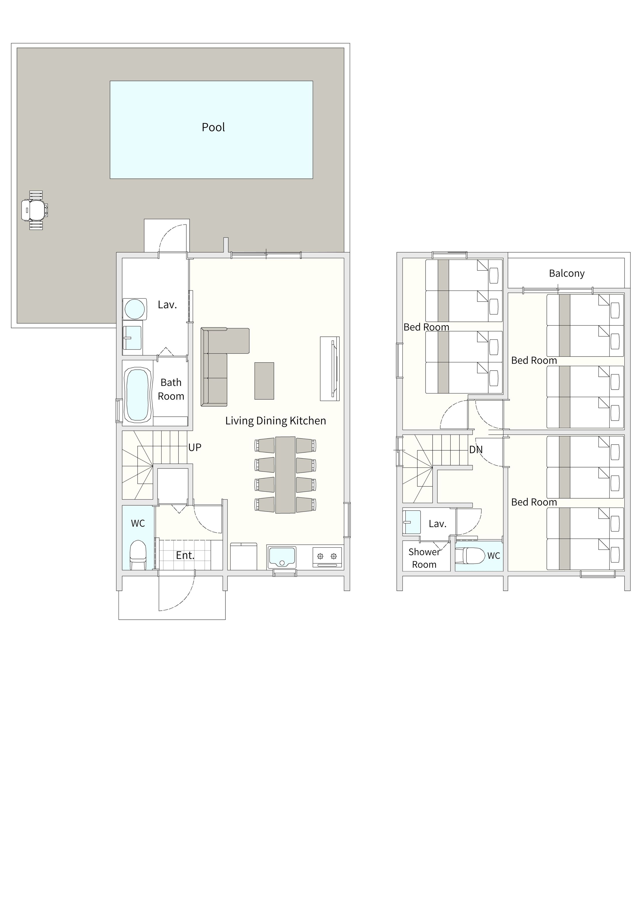 【お部屋詳細】●1階リビングダイニングキッチンソファベッド×1●2階(A棟、B棟)・寝室1:ダブル×2・寝室2:ダブル×2・寝室3:ダブル×2●2階(C棟)・寝室1:クイーンベッド×2・寝室2:クイーンベッド×2・寝室3:クイーンベッド×2※間取り図ではセミシングルベッドとして表示しておりますが、実際は並べてクイーンサイズのように配置しております。ベッドはお客様ご自身で離してご使用いただくことも可能です。●浴室・洗面・トイレ・バスルーム×1・シャワールーム×1・洗面所×2・トイレ×2(ウォシュレット・ビデ有)【アメニティ】バスタオル・フェイスタオル・歯ブラシ・ドライヤーシャンプー・コンディショナー・ボディソープ【設備】テレビ・洗濯機・ガス乾燥機・掃除機・エアコン・アイロン・アイロン台冷蔵庫・電子レンジ・トースター(B棟C棟のみ)・炊飯器・IHコンロ電気ケトル・調理器具・食器類※調味料はご自身でご準備ください【BBQスペース】場所:プールサイドBBQグリル・テーブル・チェア・チャッカマン【お子様用備品】ベビーベッド(プレイヤード)・ベビーチェア・ベビーバス<その他ご注意事項>・当施設は完全無人ホテルとなります・ご予約後下記のご対応をお願い致します (1)お客様情報提出(宿泊3日前迄) (2)宿泊2日前にチェックインガイドをメールでお送りしますので鍵情報等をご確認ください・ご滞在中の清掃やお荷物お預かりは行っておりません・近隣の皆さまへのご配慮のため、BBQやプールなど屋外のご利用は 9:00〜21:00 とさせていただいております。上記以外の時間は、室内で静かにお過ごしいただきますようご協力をお願いいたします。・食器類のお片付けは不要ですが洗浄までご協力頂けますと幸いです・設備の損傷等は別途ご請求する場合がございます