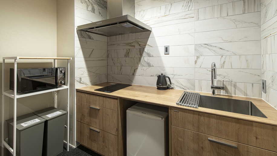 また全室キッチン付きなのでちょっとしたお料理も作れます。もちろん食器や調理器具つきなので安心。