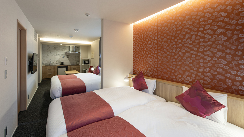 フォースルーム朱 幅1100mm×丈1950mmのベッド4台 キッチン付き 40平米 3名様から4名様のご利用