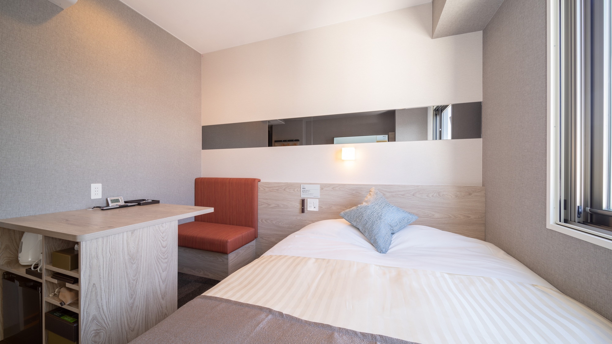 150cm幅のワイドベッド+広々デスクの【エクストラルーム】です。 広々デスクで仕事や作業がしやすいお部屋です。