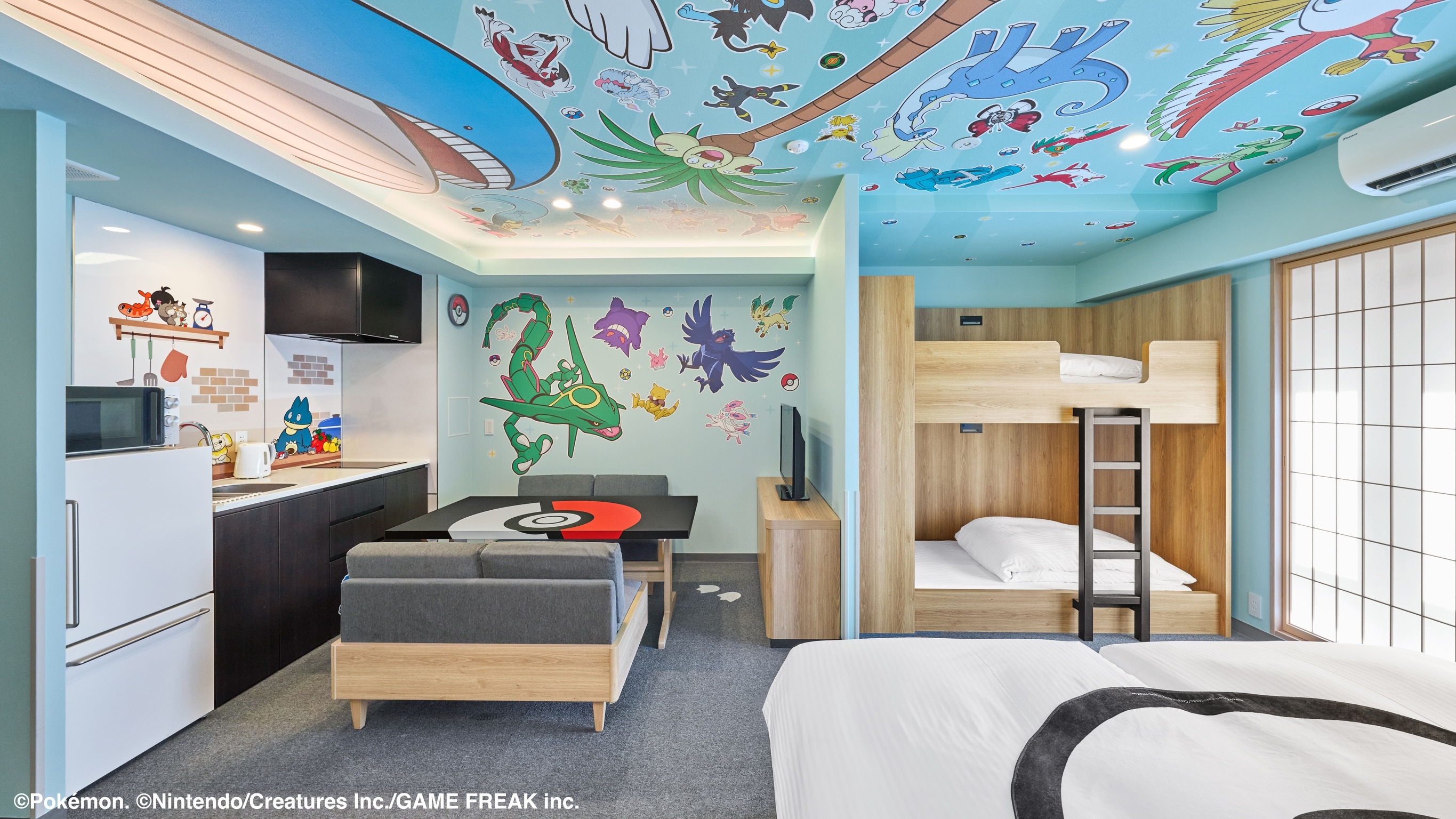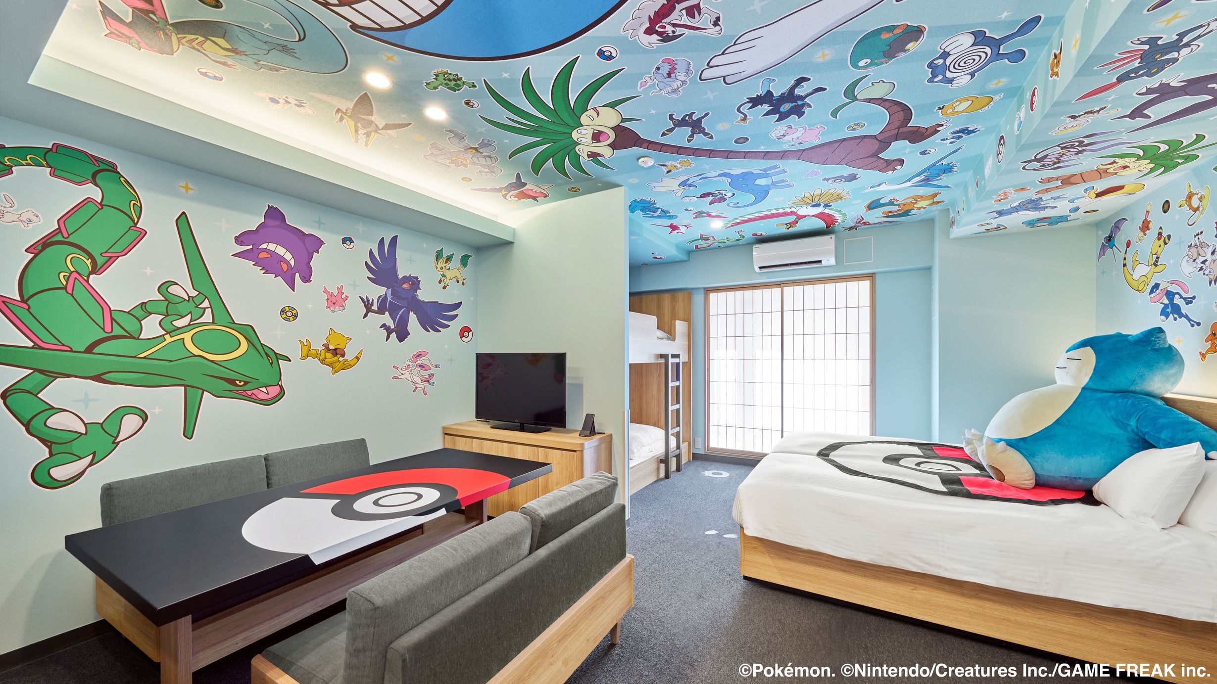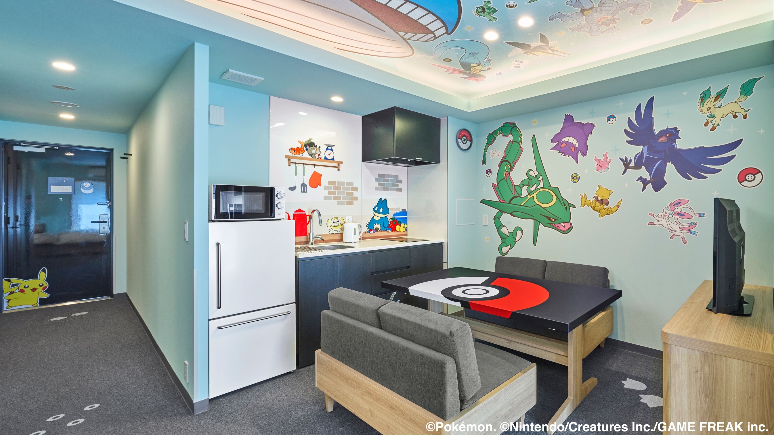 ベッドで寝ているカビゴンやキッチン、バスルームまで部屋のあちこちにいるポケモンが、みなさんをお出迎えいたします。