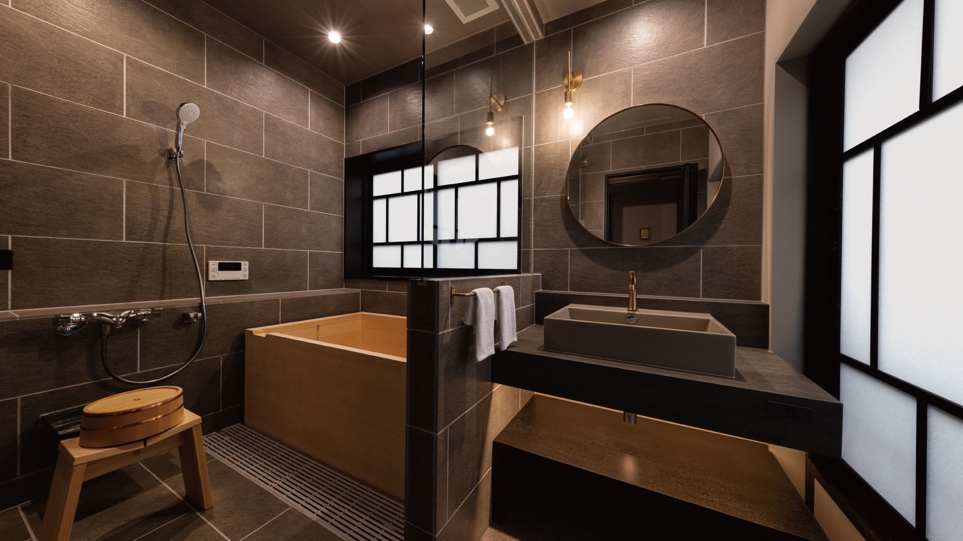 <令和5年5月NEW OPEN>「櫂棟」と同様に【客室内檜風呂】を備えております。 お部屋からは 鞆らしい「穏やかな街並み」が広がります。