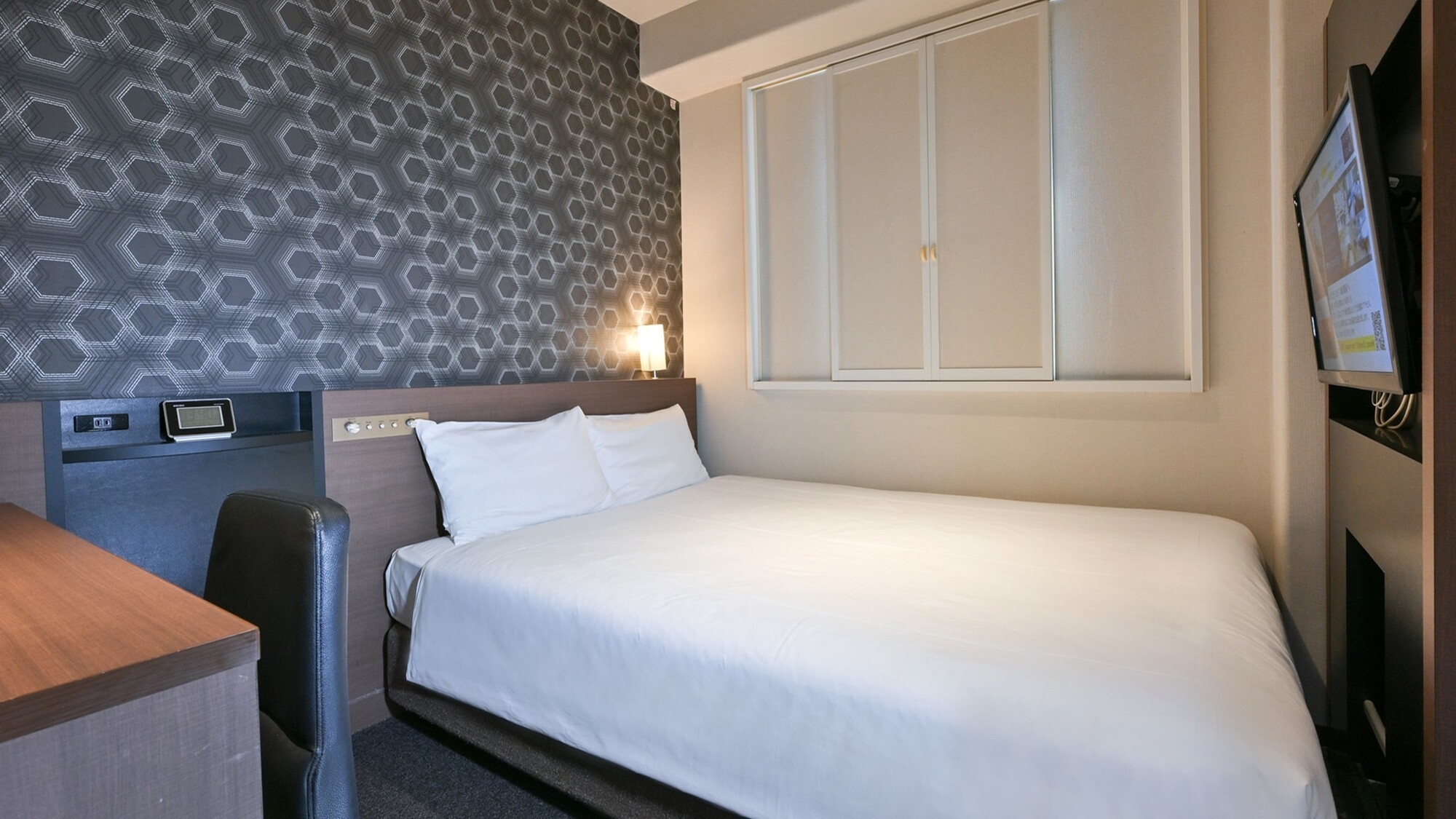 140cm幅のダブルベッドを使用。茶色をベースとした落ち着いた色合いのお部屋でゆっくりとお寛ぎ頂けます