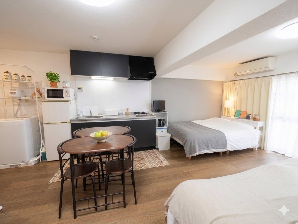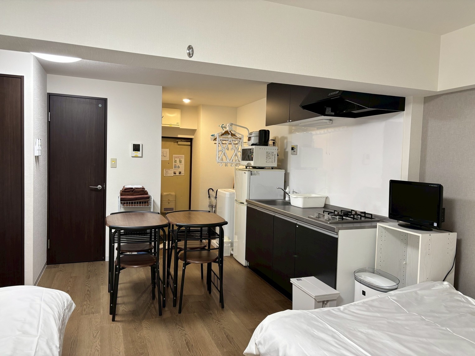 【2025年秋 全面リフォーム済み】34.78㎡の広々空間をまるまる貸切。ダブルベッド3台完備でグループ・家族旅行に最適。■ お部屋のポイントフルリノベーション済: 2025年秋に室内を全面改装。清潔感あふれる空間です。広々34.78㎡: 1ベッドルーム+キッチンのゆとりあるレイアウト。最大収容: ダブルベッド3台を配置し、複数名でもゆったりお休みいただけます。■ 設備・アメニティキッチン: コンロ、調理器具、食器一式を完備(※調味料・油はご持参ください)。バス・トイレ: バスタブ付き浴室、ウォシュレット完備、独立洗面台。快適設備: 高速Wi-Fi、TV、洗濯用品(洗剤・干し場・ハンガー)、ドライヤー。アメニティ: シャンプー類、タオル類(バスタオル・フェイスタオル)、歯ブラシ、スリッパ。■ ご案内(必ずご確認ください)当物件は2階にございますが、エレベーターはございません。 階段をご利用ください。TVでの動画配信サービス視聴には対応しておりません。