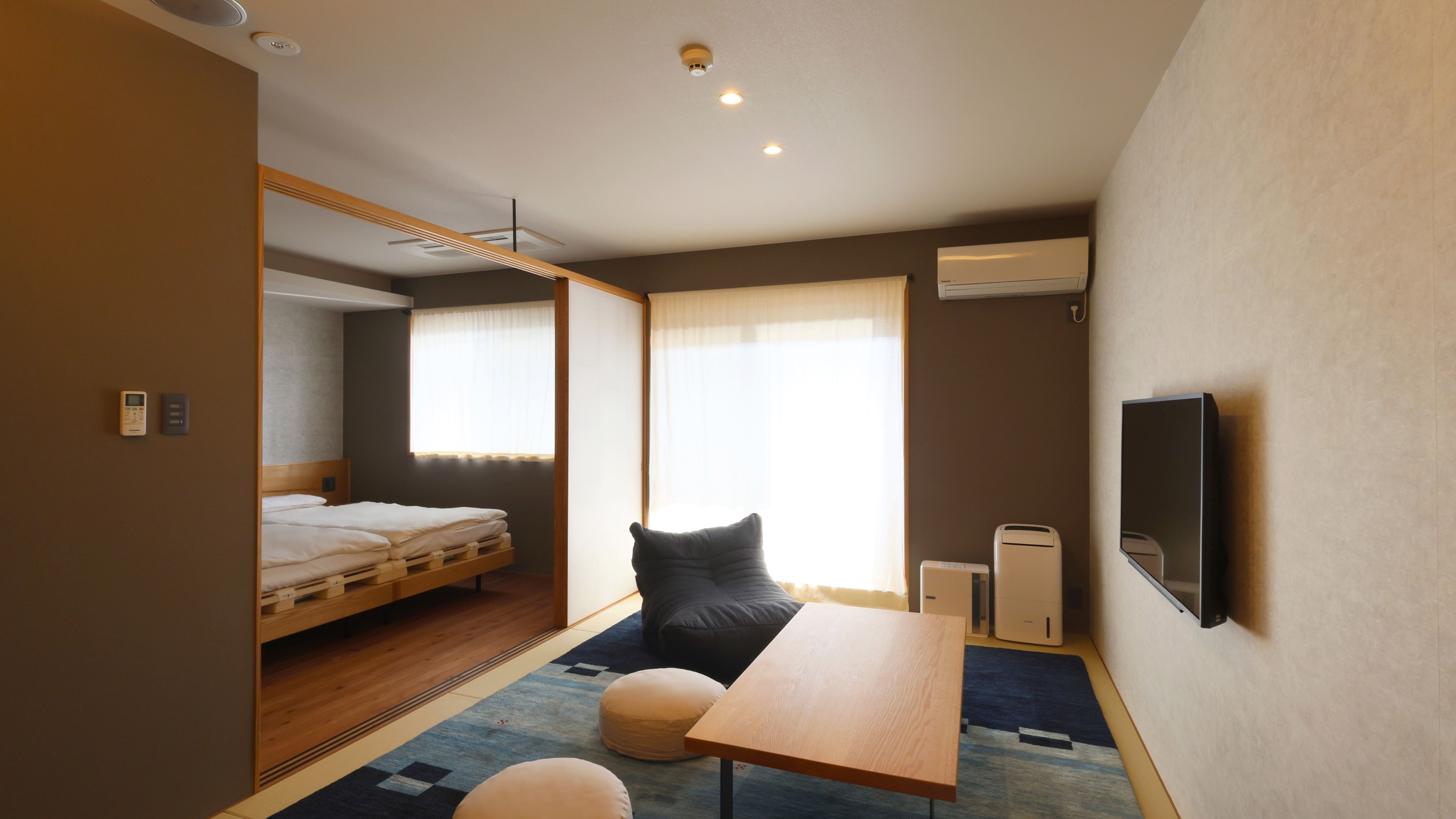 全て和洋室タイプのお部屋。高級寝具をしつらえたシングルベッド2台、3名様から布団用意、キッチンも備えたコンドミニアム。※天然5層のお布団はベッドのみとなります。