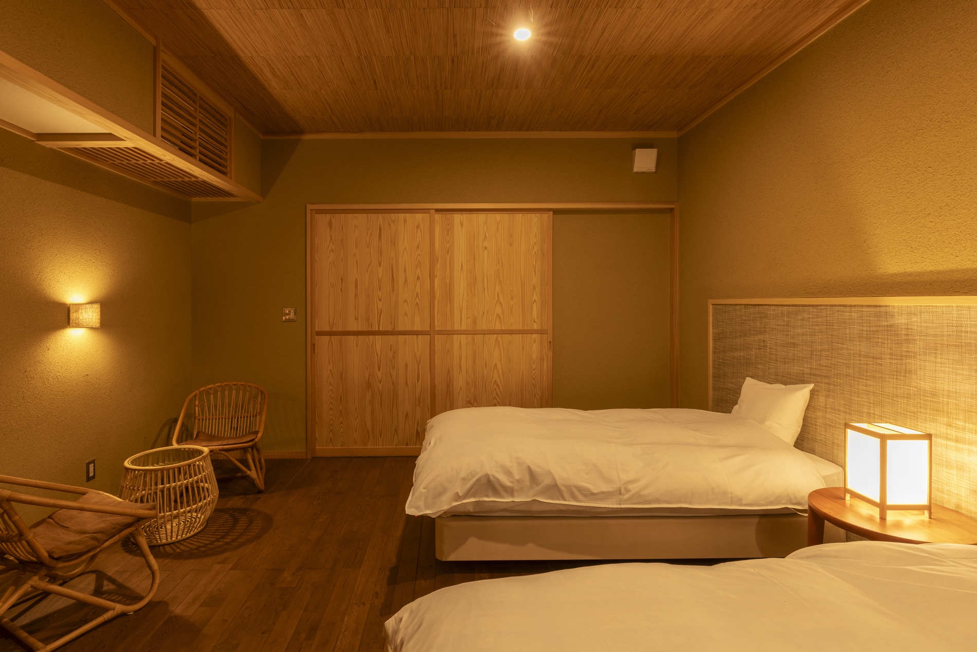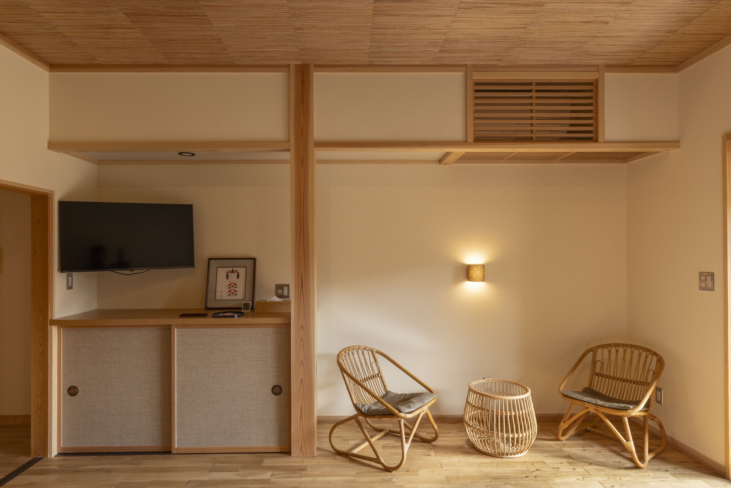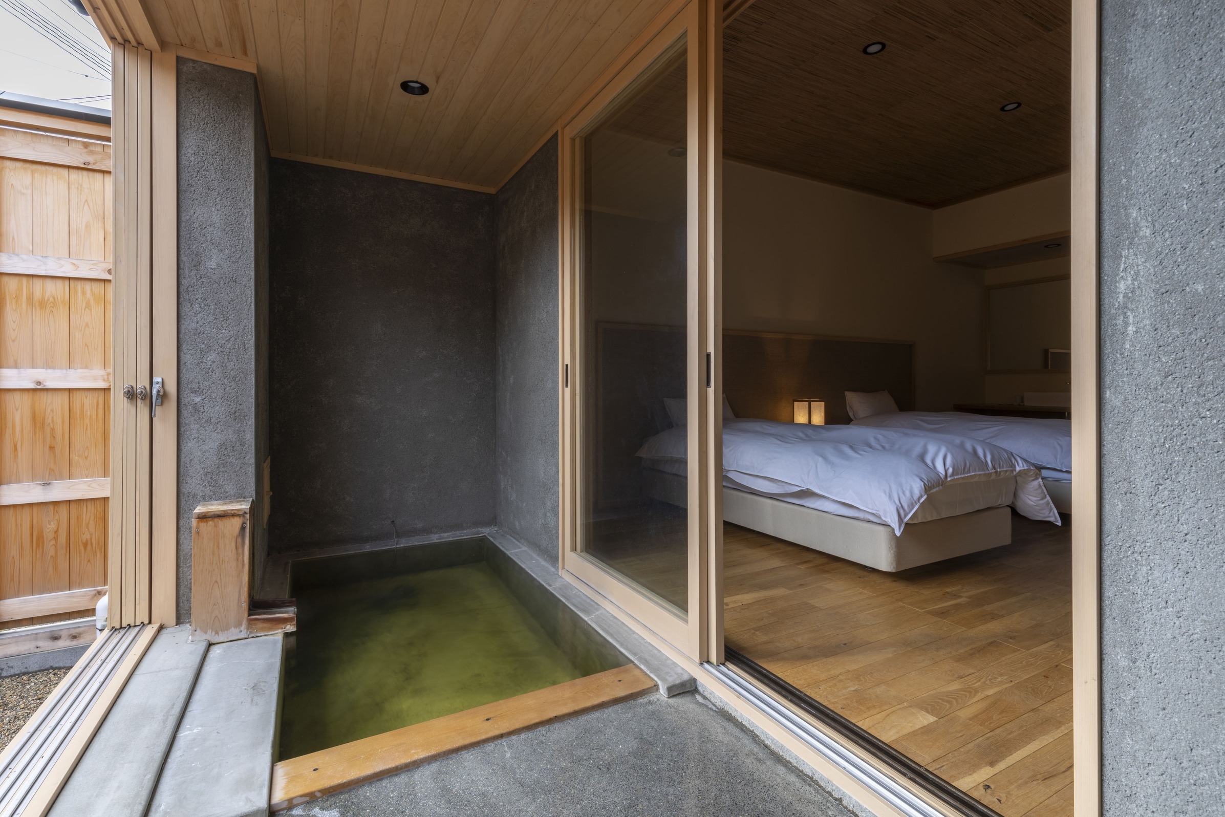 本館1階、土、木、和紙、布など、素材を感じる落ち着いた内装のお部屋に、人目を気にせず、好きなだけ温泉を堪能できる半露天風呂、坪庭が付いた新しいお部屋です。