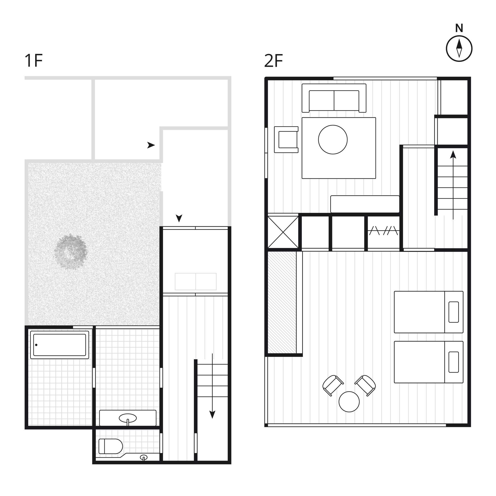 吹き抜けの玄関スペースから階段を上がると、大人の隠れ家をイメージした屋根裏のようなベッドルームが広がります。広々としたバスルームには檜風呂をご用意。