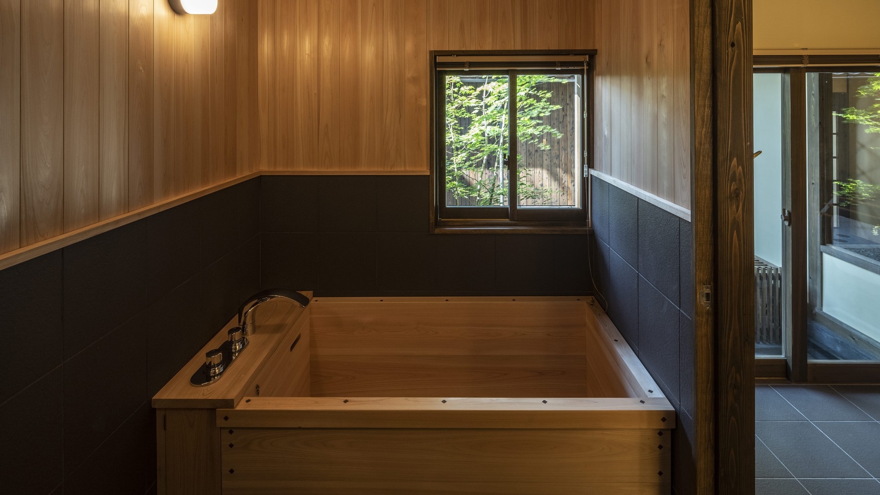 観光に便利な立地にある一棟貸切のお部屋。角部屋を生かし広く設置された窓から大洲のまち並みを一望できます。坪庭を眺められる、檜風呂で旅の疲れを癒すバスタイムを。