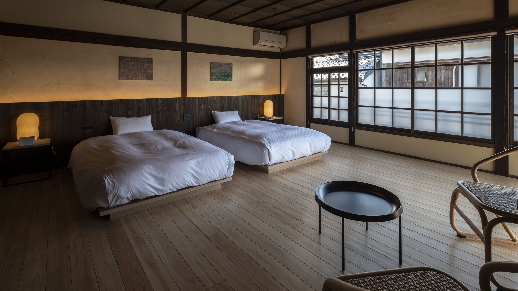2階の窓からは、棟の中央に位置する中庭を眺められ、かつて宮内省から贈られた梅の古木がその歴史を物語ります。2名様で広々とお過ごしいただけるお部屋です。