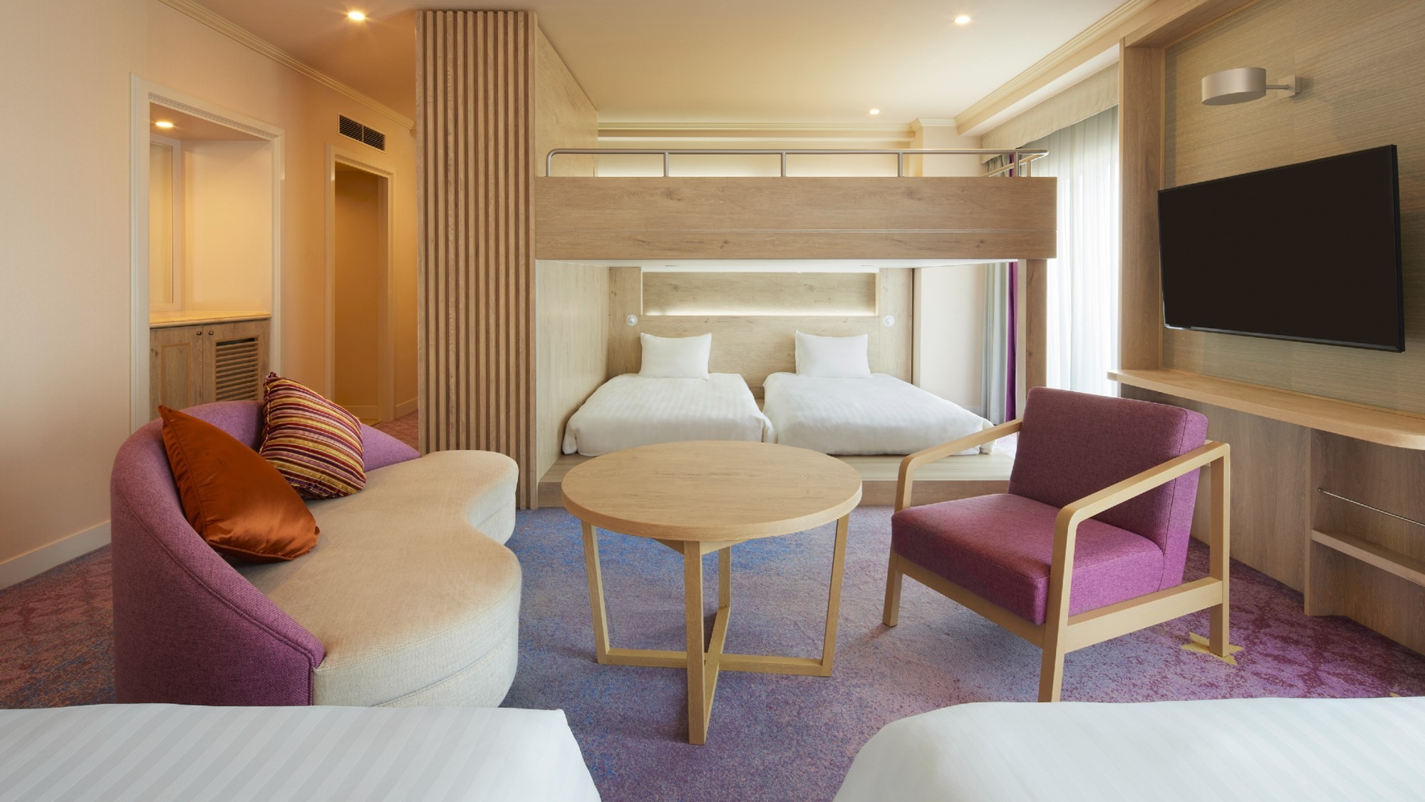 ホテル上層階「ニッコーフロア」に位置するファミリールーム。 ベッド4台とリビングスペースを配置した広めのお部屋でバルコニーからはパーク側の景色を望めます。