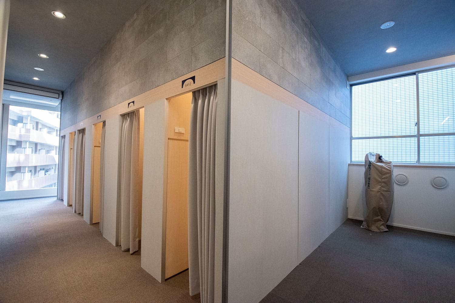 女性用カプセルタイプ。コンセント付きのコンパクトな空間で快適にお過ごしいただけます。共用のワークスペース、キッチン、ランドリー、シャワーをご利用いただけます。