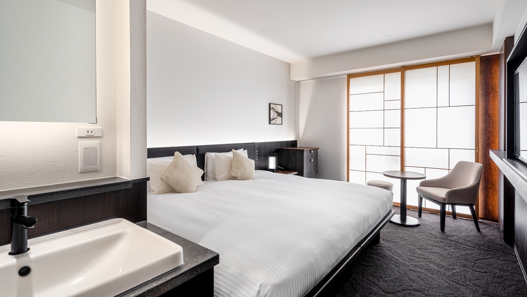 ゆとりのあるキングベッドを配した客室。 多彩な設備を完備した空間で、贅沢な時間をお愉しみください。(バスタブはございません。)