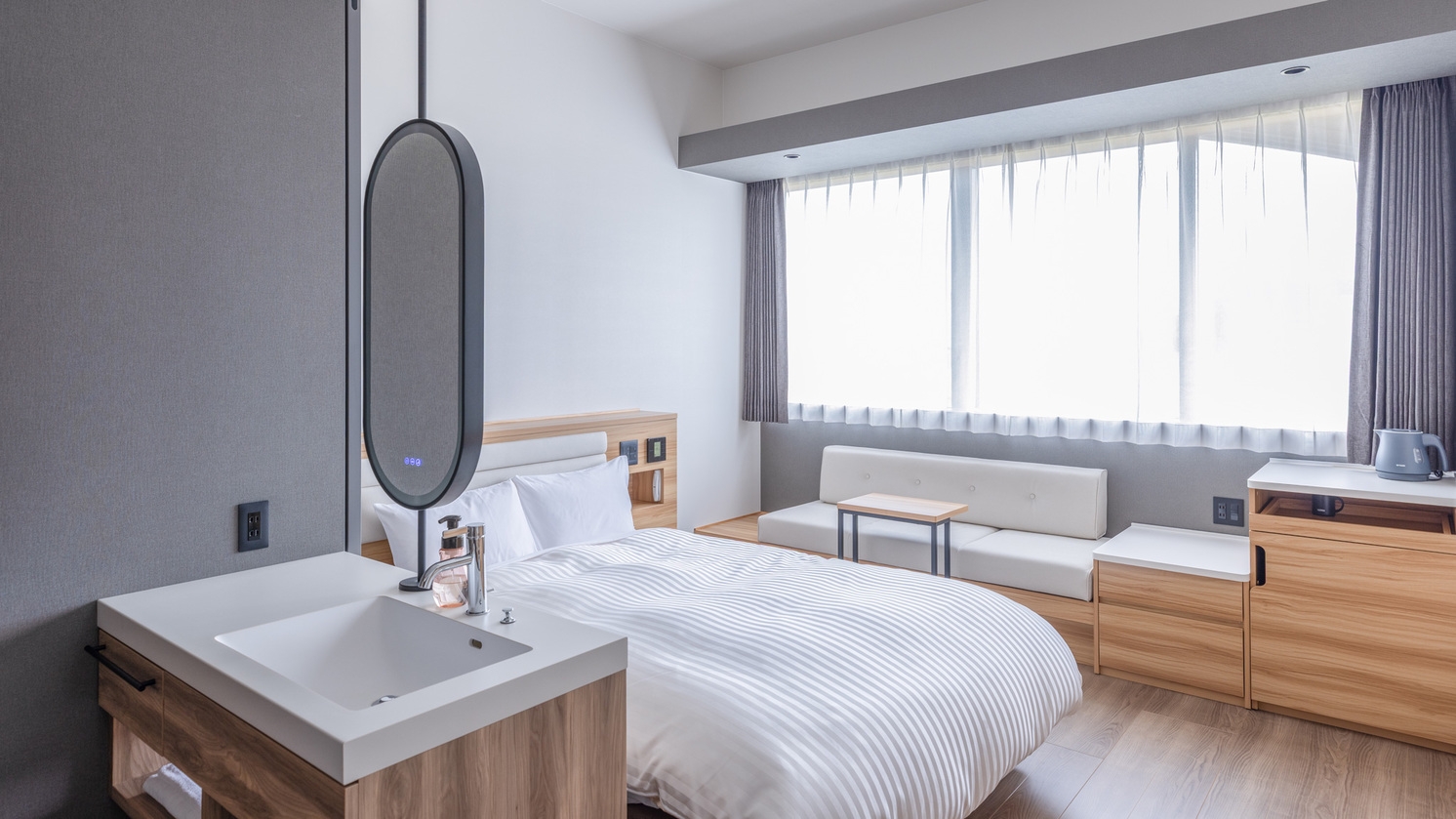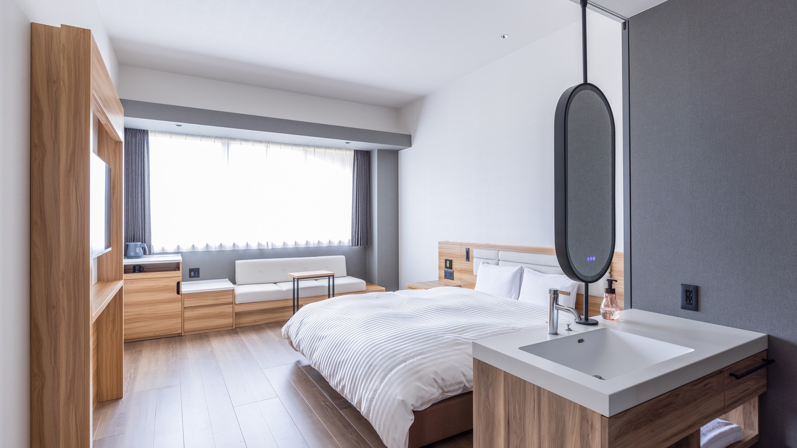 【禁煙】25年11月新設。20平の広々なお部屋です。シャワーブース・お手洗いがそれぞれ個室の贅沢な間取りです。140cm幅のベッド、スマートTV、Wi-Fiも完