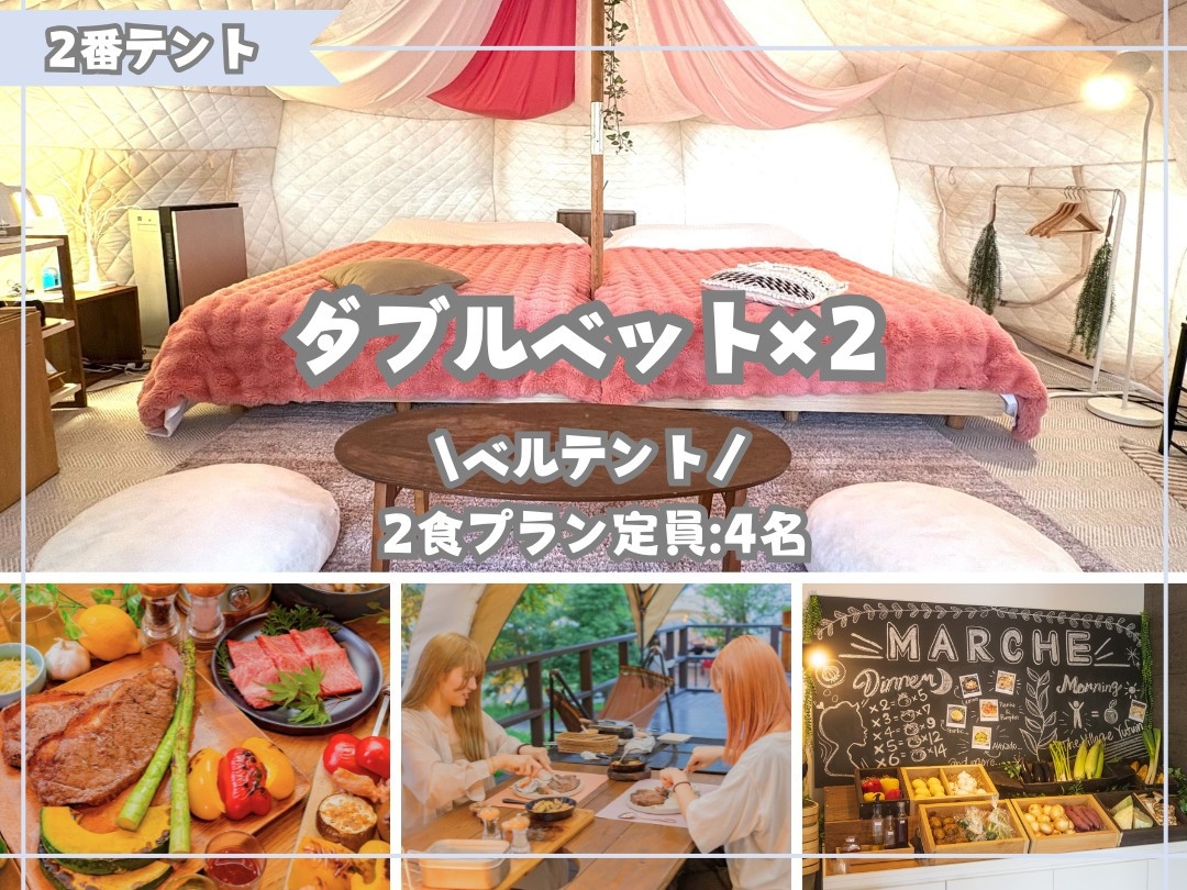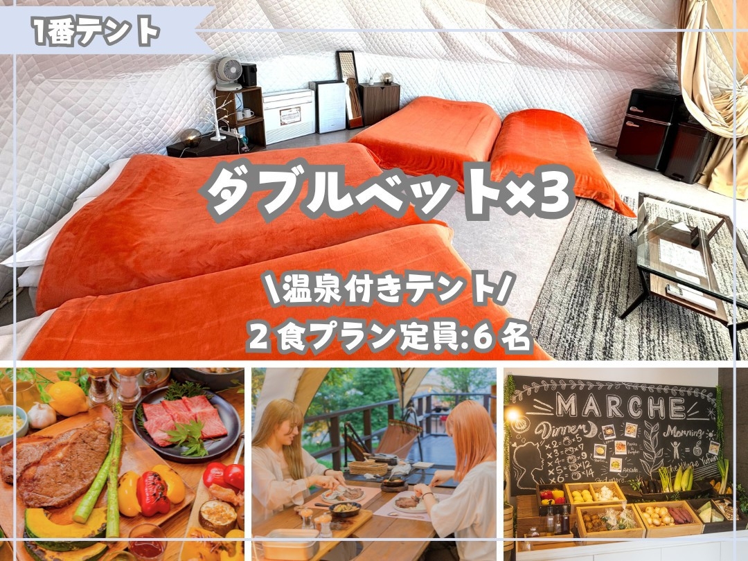 R6年2月オープンの客室!50平米もある広々としたテントでゆったり。冷暖房・冷蔵庫・電気ケトルに加え充実のアメニティ。クラブハウス内の天然温泉利用可能!
