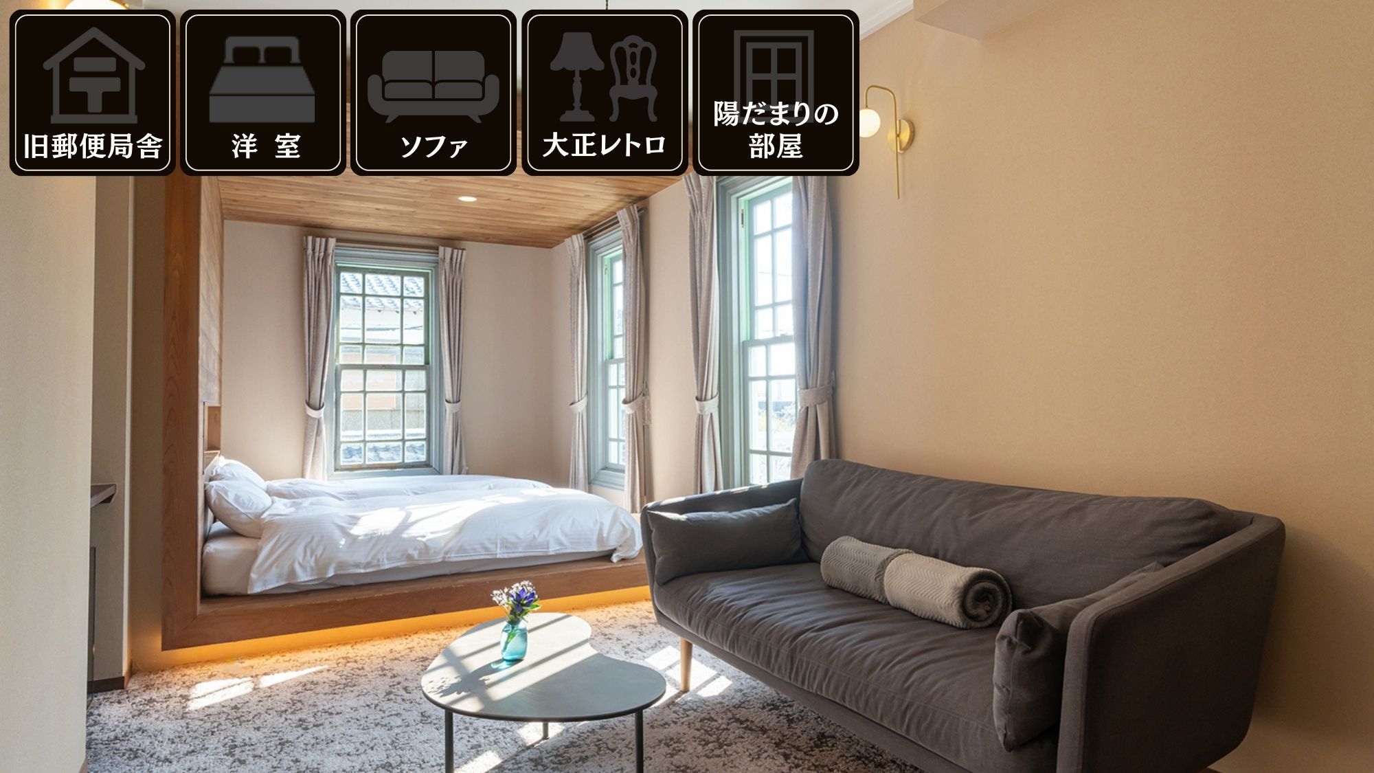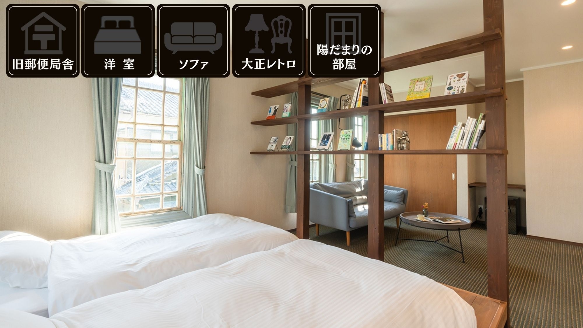 大正12年築の旧辻川郵便局舎をリノベーション。 レトロな窓枠とデザイン性の高いインテリアが人気。1階共有スペース・妖怪BOOKCAFEでは読書も楽しめます