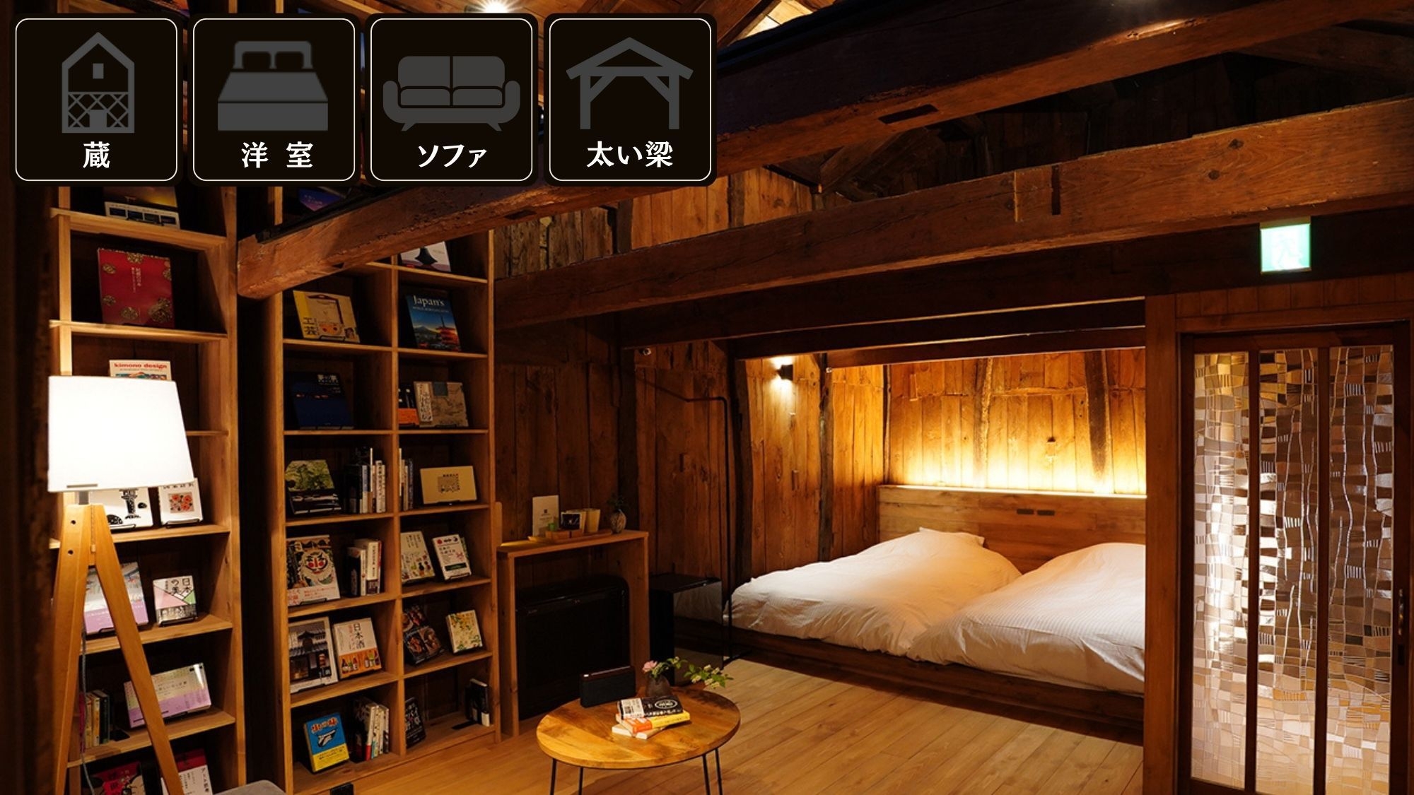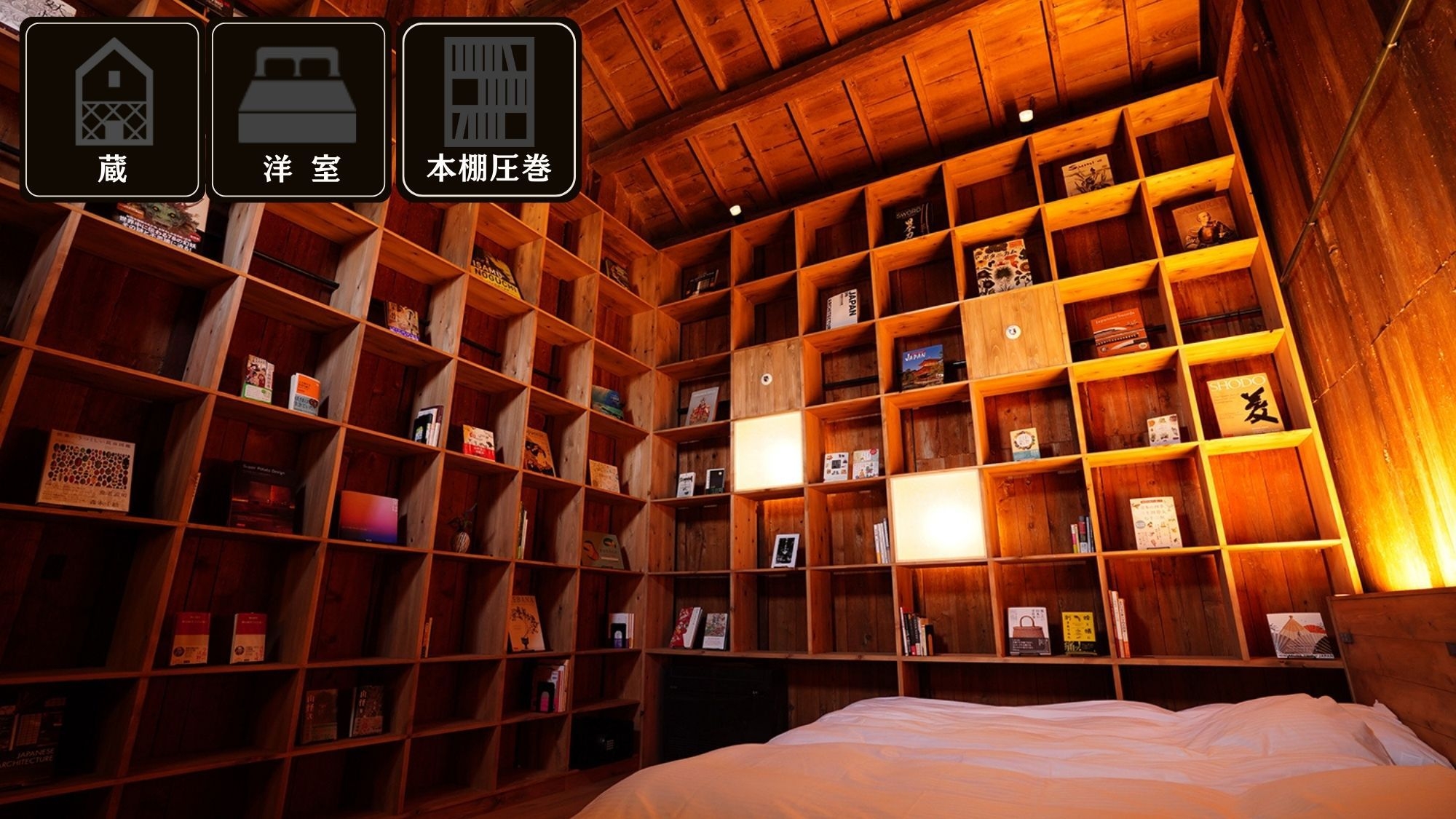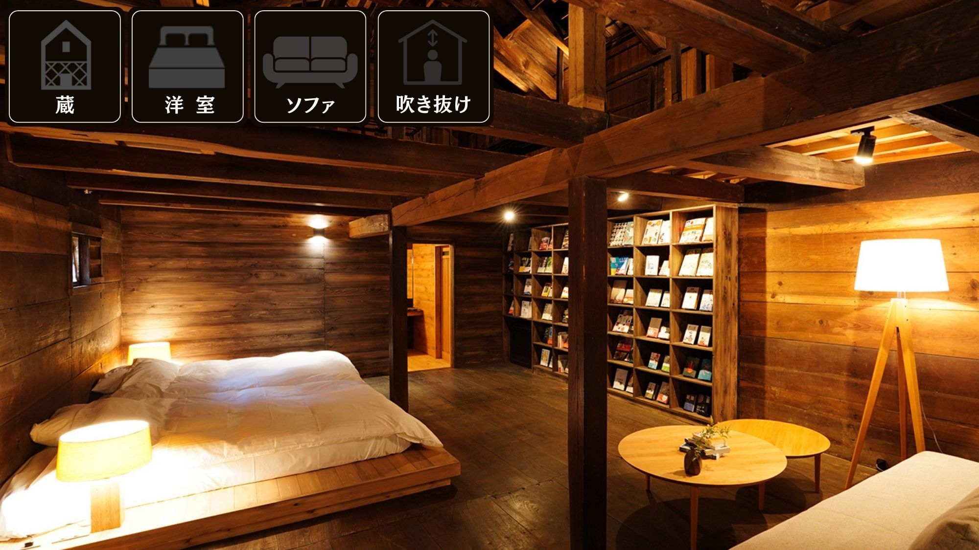 見上げるほどの高い本棚が印象的な 【米蔵-KOMEKURA-】 敷地の一番奥、大きな米蔵の土間部分を採用。まさに「本と暮らす」ようなひとときを味わえる一室です。