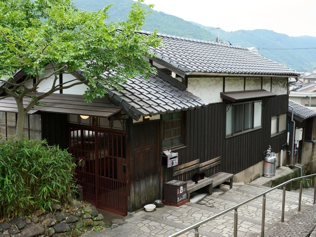 汐待の港鞆の浦の港を見下ろす小さな山の上に建つ鞆猫庵。※建物内・敷地内ともにすべて禁煙となります。