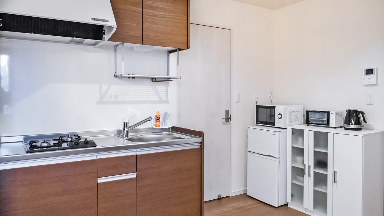 大人1名につき幼児1名添寝可(最大2名迄)/シングルベッド2台、ソファベッド1台/キッチン・調理器具・電子レンジ・冷蔵庫/タオルセット/スリッパ/金庫/洗濯機
