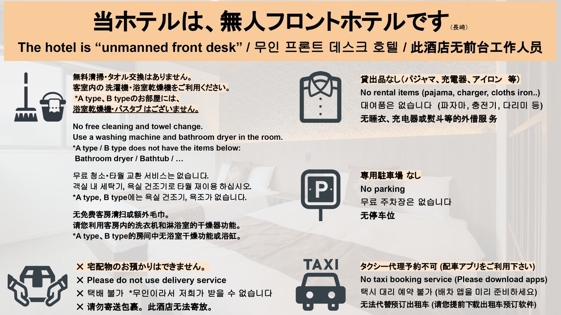 ・連泊中の清掃、ゴミ回収・リネンやタオル交換はございません。