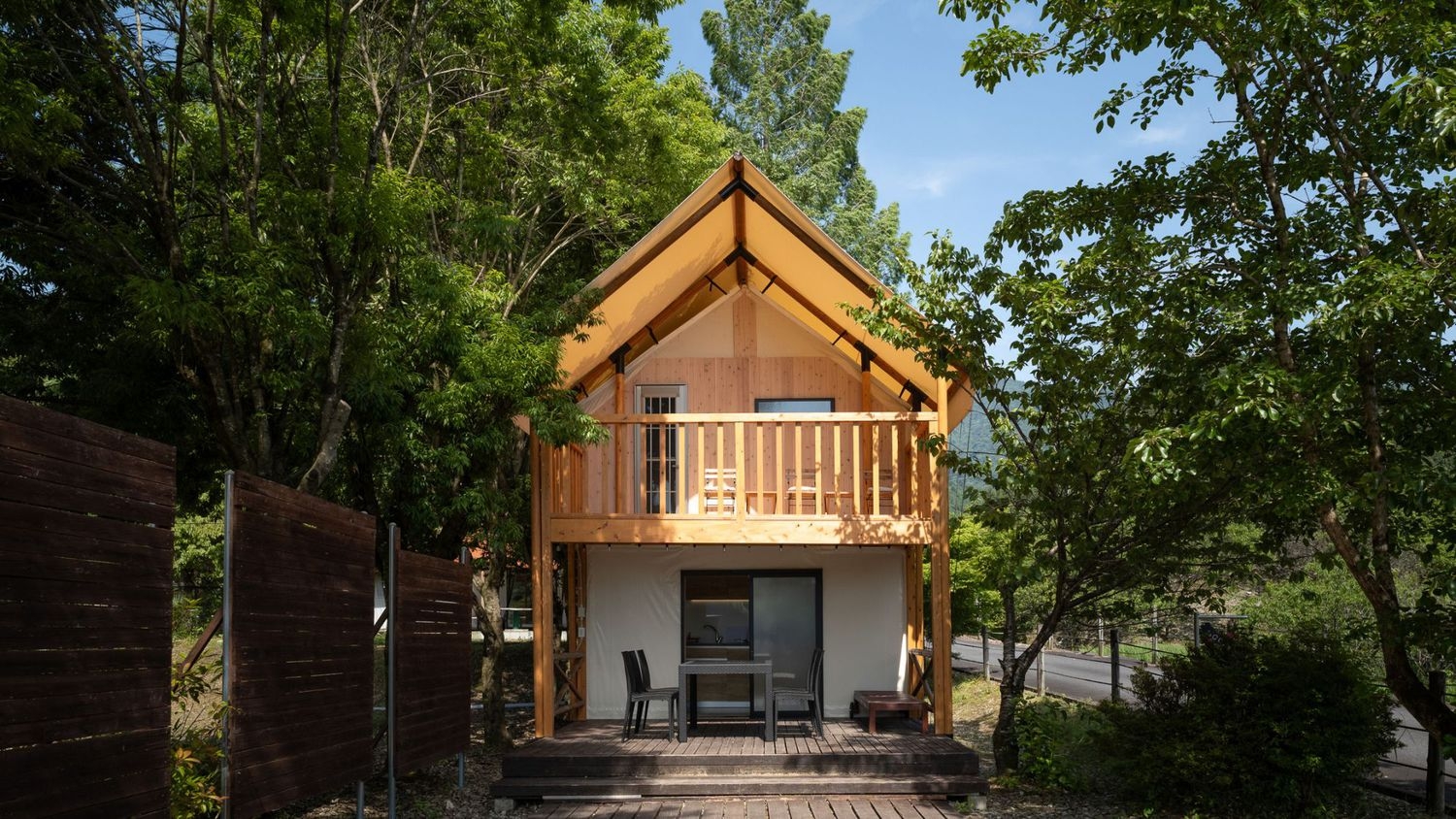【禁煙】2階建てでリビングと寝室が分かれ、家族や仲間とドームテントとはまた違った時間を過ごせます。Wi-Fi接続無料・トイレ・シャワールーム付・冷蔵庫有