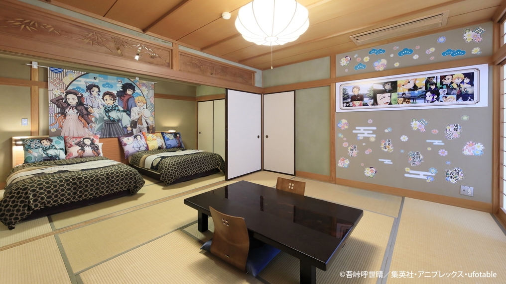 特別な描き下ろしイラストの隊士たちが出迎えるコラボルームです。ベッドを2台設置した和室で、3名様以上の場合は1〜2名様分は和布団でのご用意です。※テレビなし