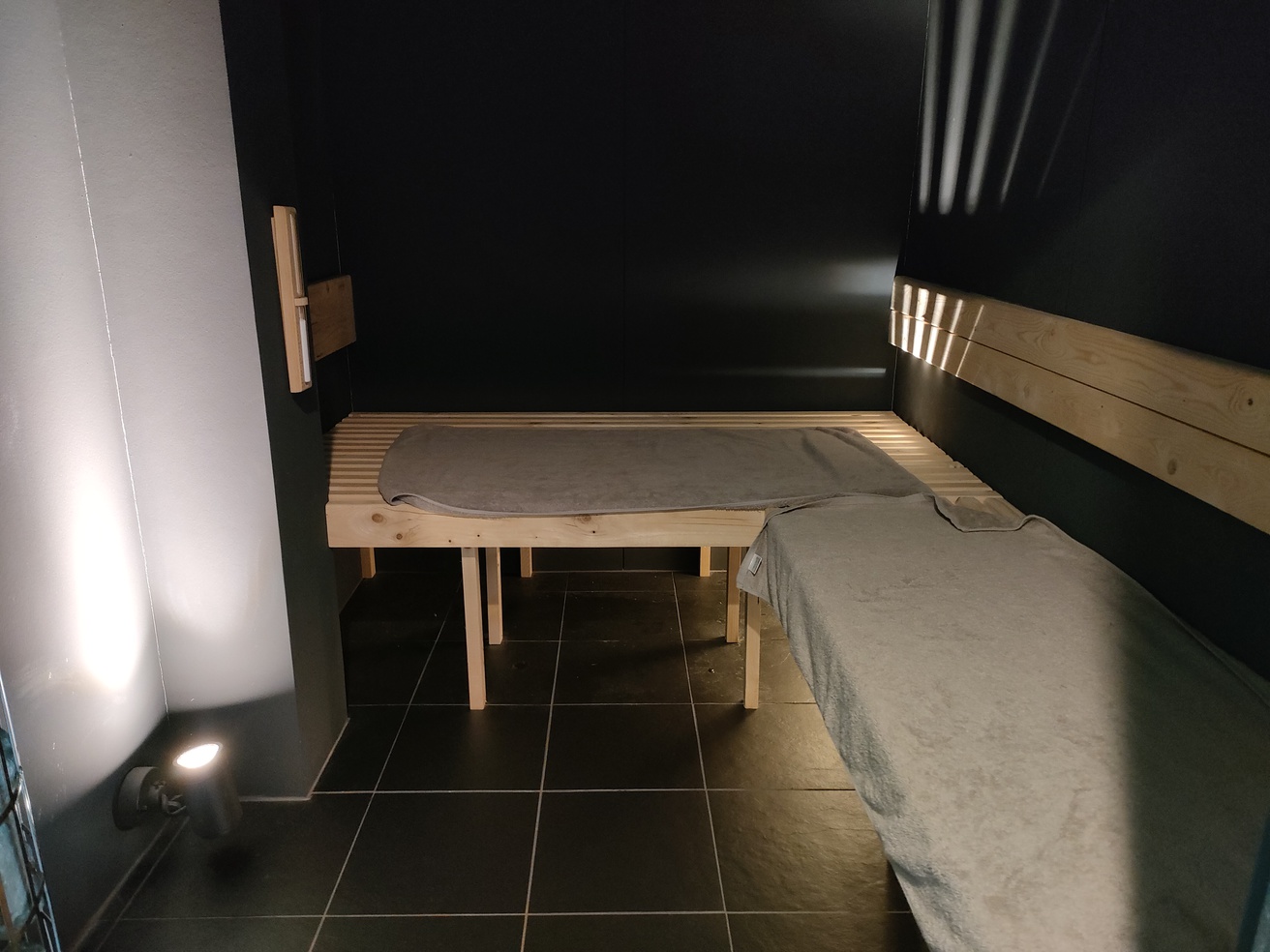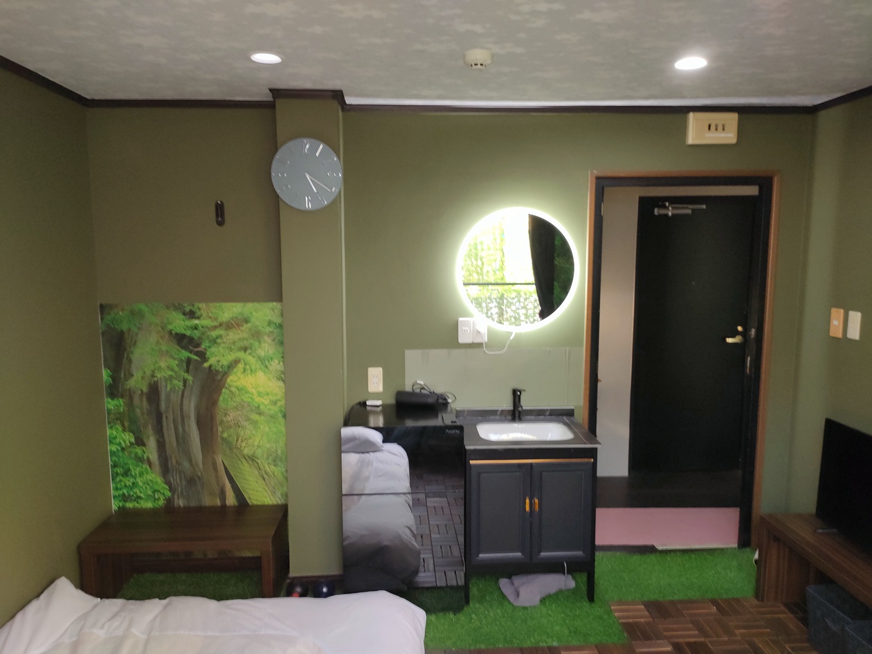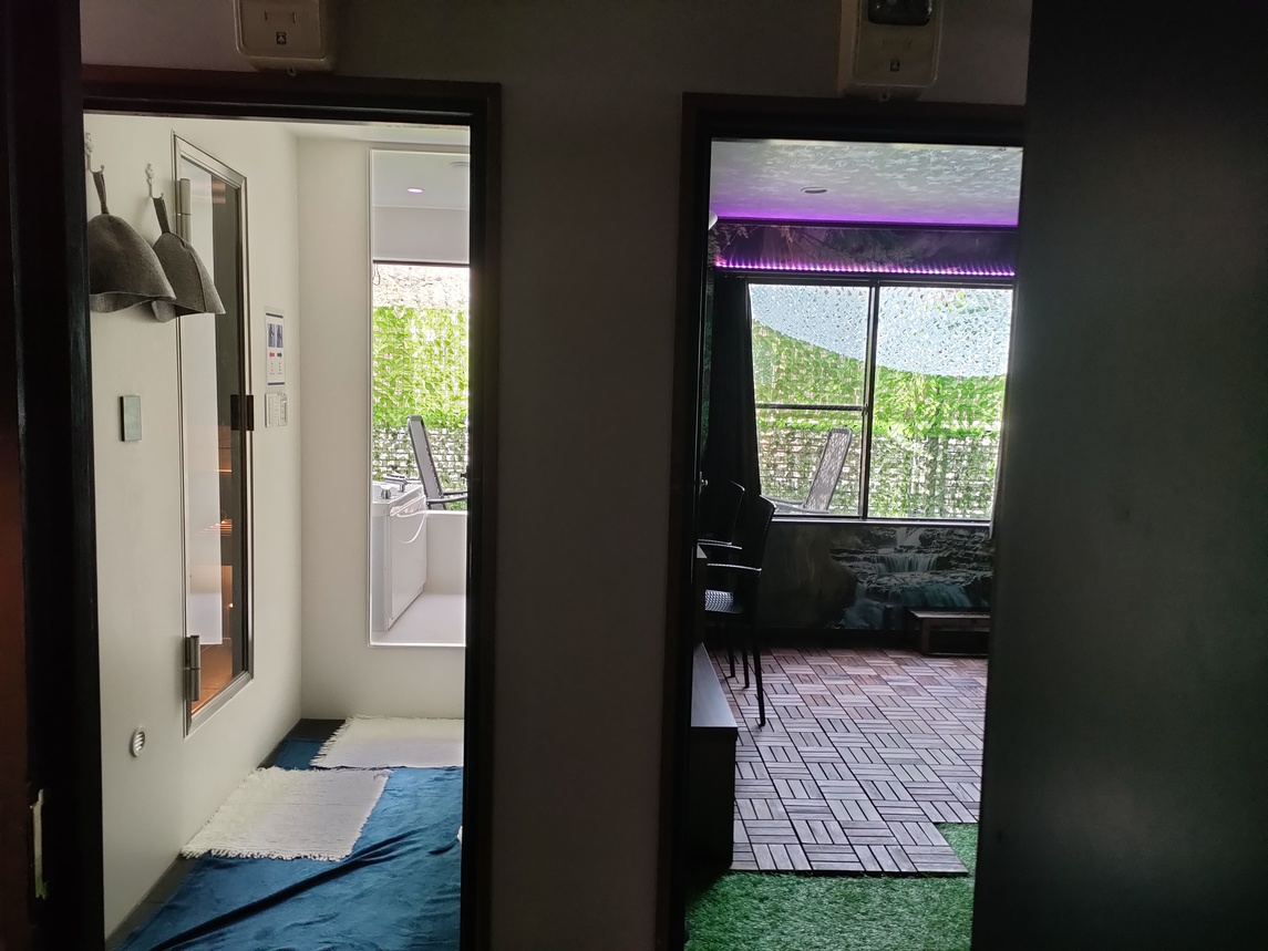 お部屋の中にユニットバスとサウナがあります。