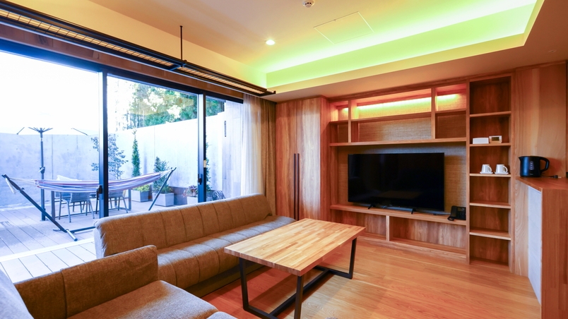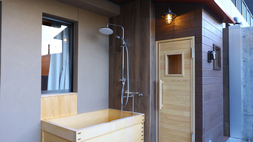 ■45平米■Wi-Fi利用可■キャビンマット×4台■バスなしシャワーブース付■VOD対応55型テレビ■檜葉露天風呂付