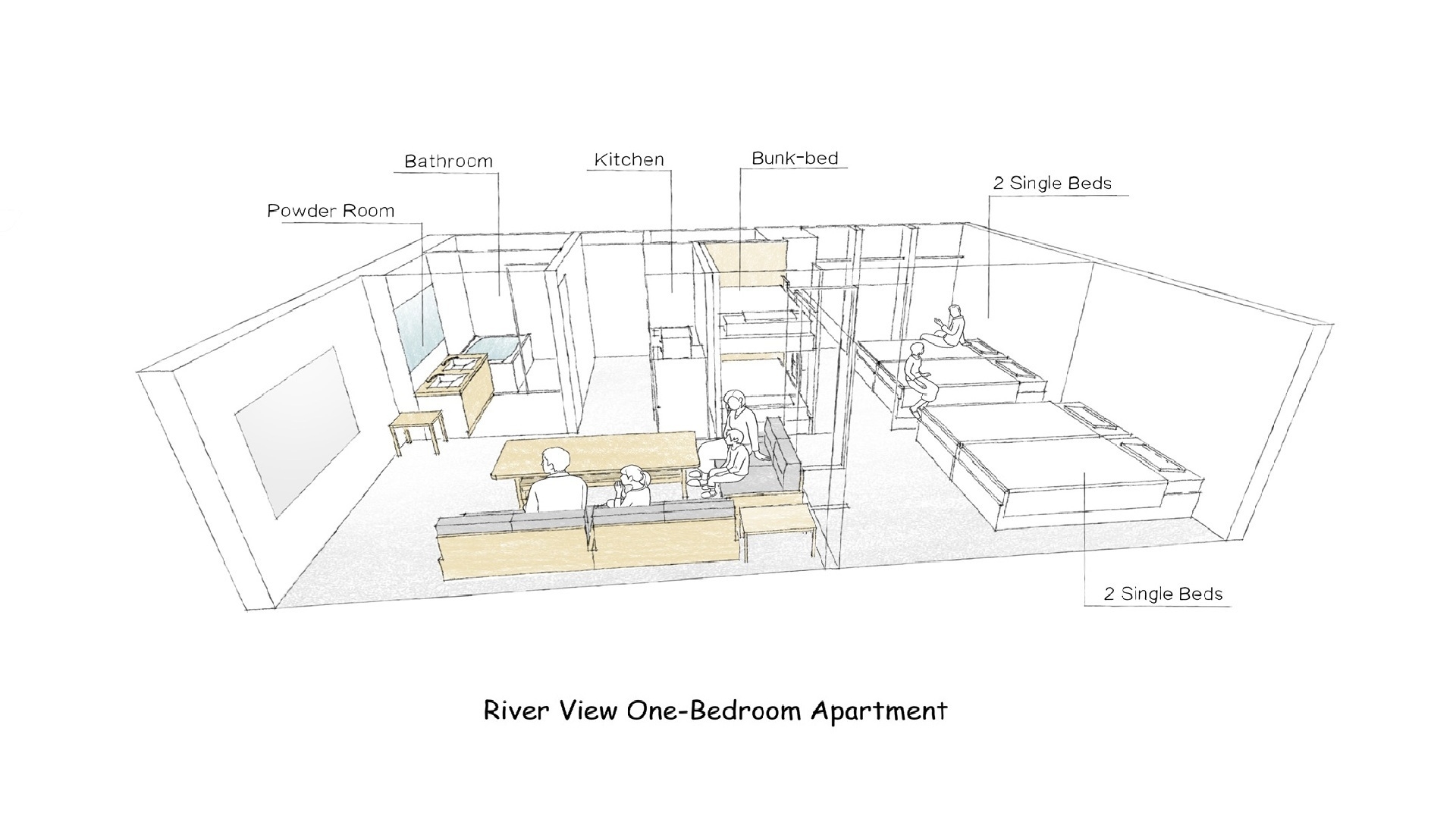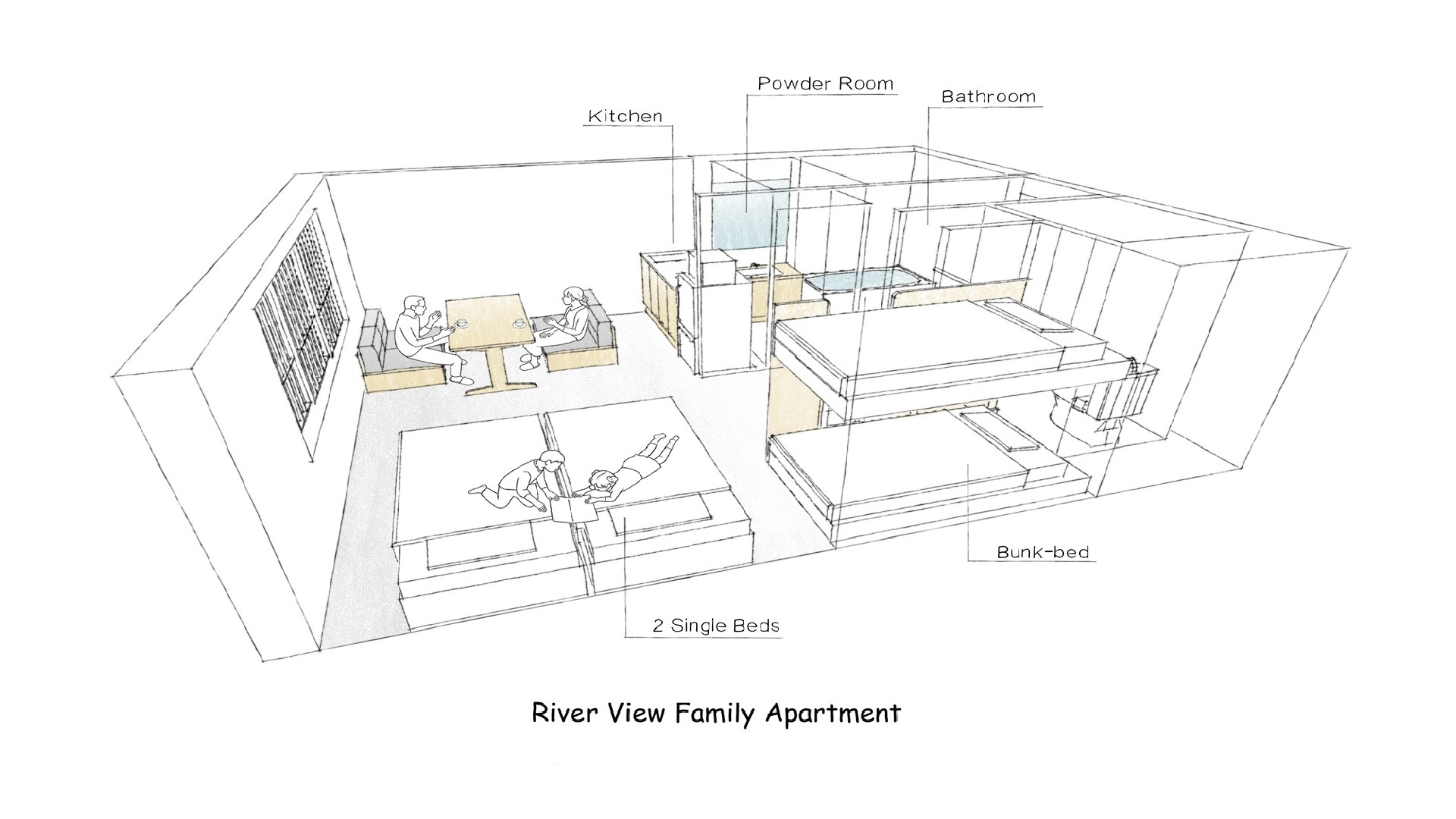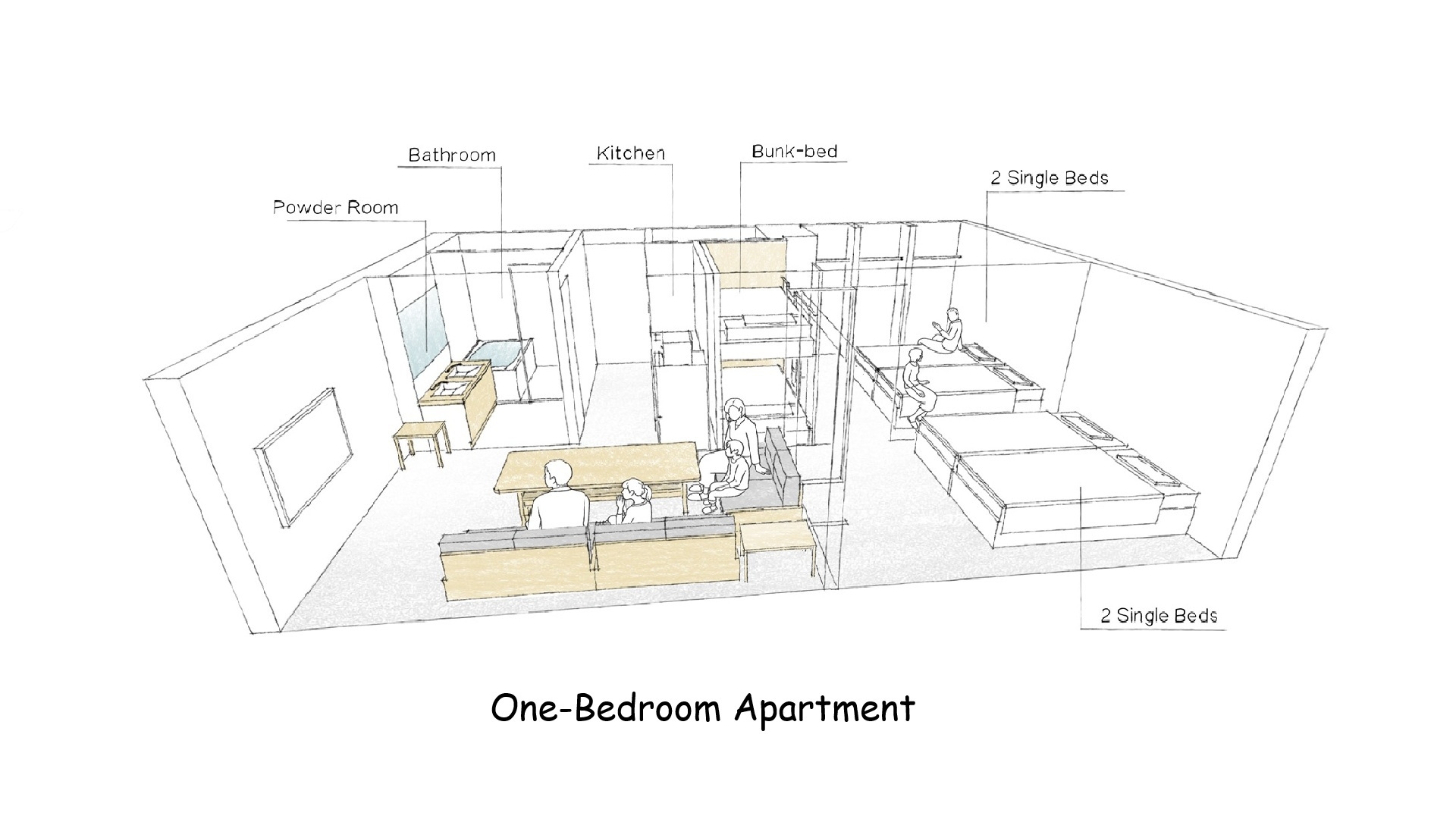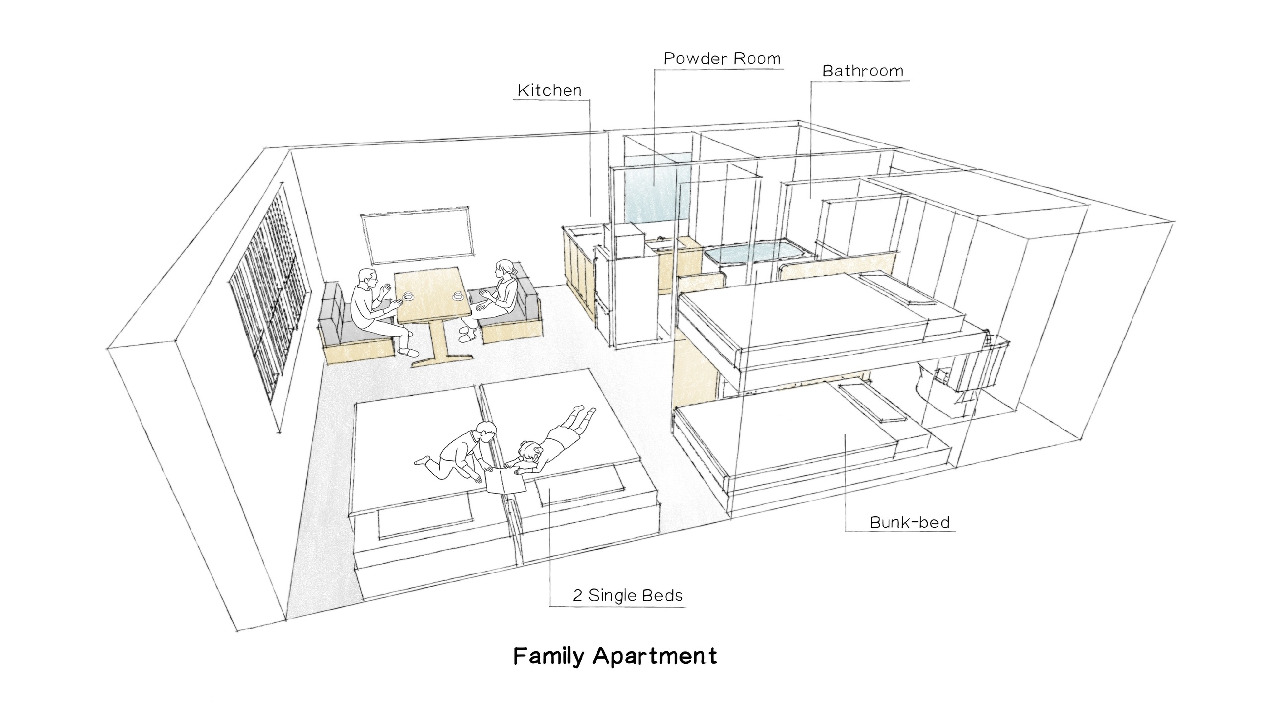 シングルベッド×2台、二段ベッド×1台(6歳以下の子供2名まで添い寝可)カップル・ファミリー♪キッチン・ダイニング家具家電付。無料Wi-Fi長期宿泊も◎