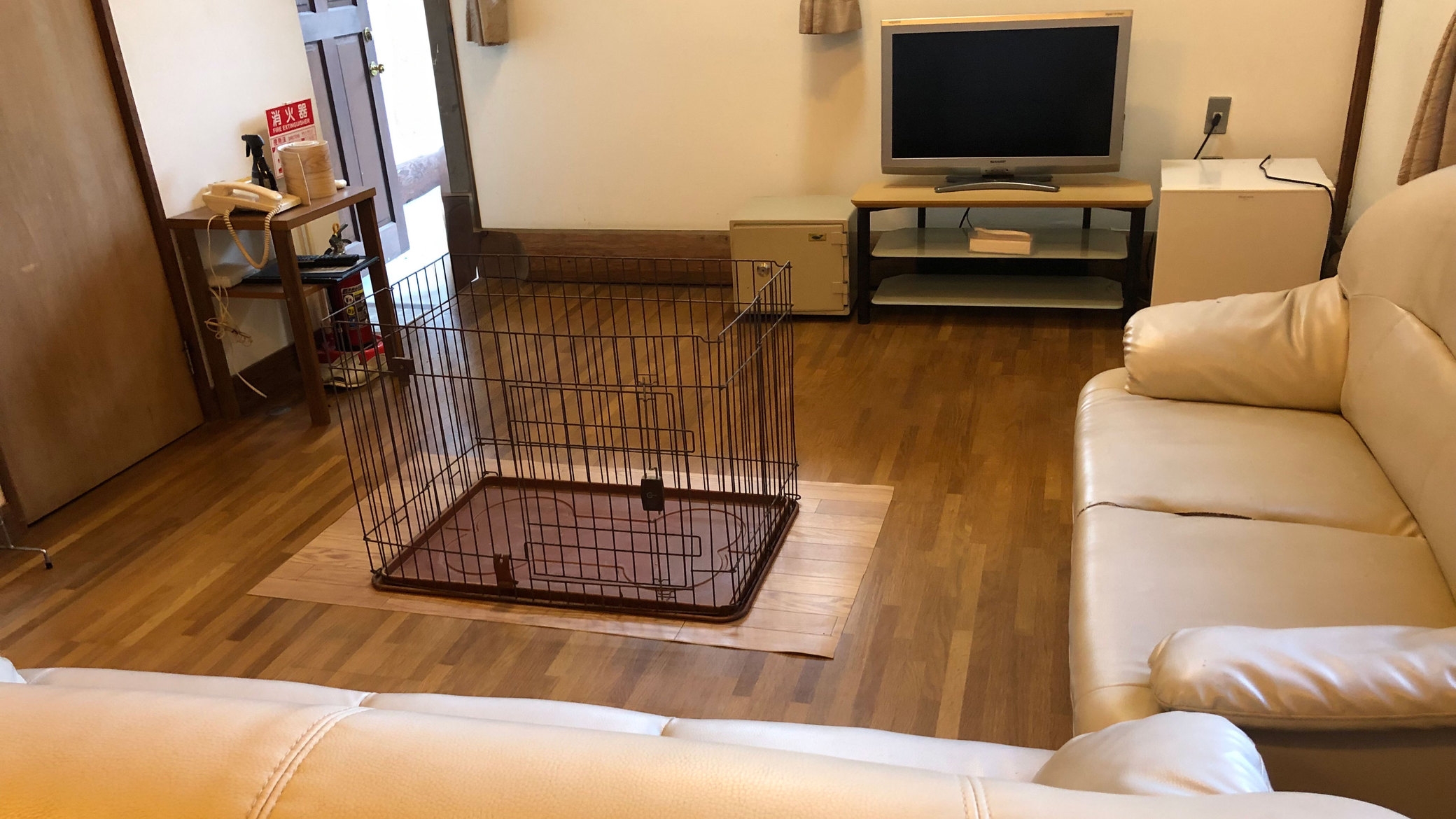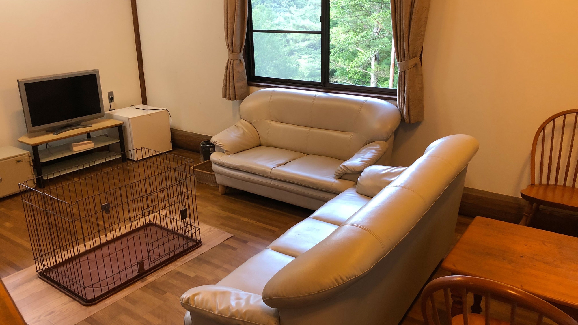 ペット同伴OKの洋室になります。愛犬と一緒にごゆっくりお寛ぎください。わんちゃんは、基本ゲージを利用していただき、2Fはペット利用不可です。