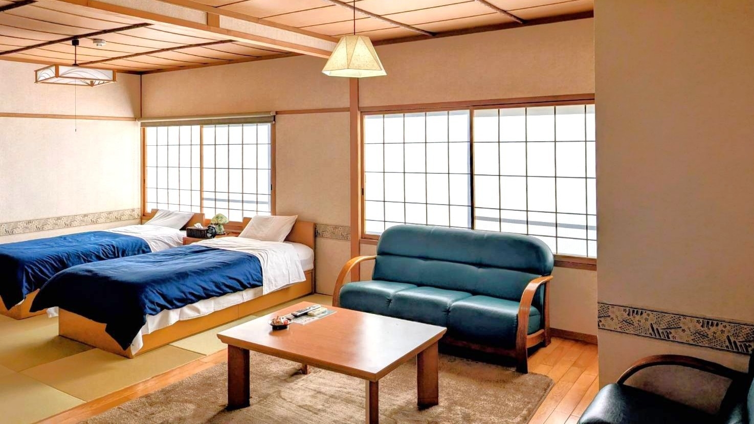 3〜6名利用可/和室二間+フローリング間/シングルベッド2台を配した畳スペースと和室に布団4組/フローリングのリビングスペースもありファミリーやグループに最適
